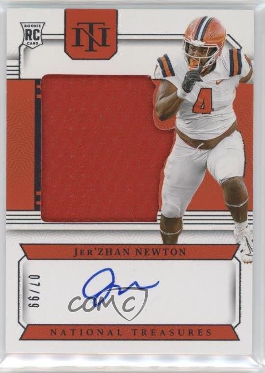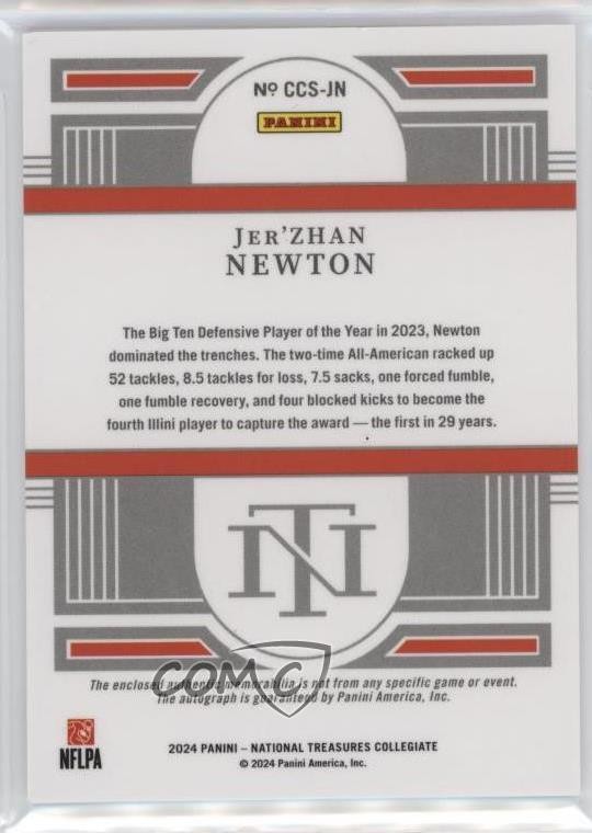 The 2024 Panini National Treasures Collegiate College Patch Auto Jer'zhan Newton /99 is a highly sought-after sports trading card featuring an autograph from the player. This limited edition card is part of the National Treasures Collegiate set, with a print run of only 76 out of 99. It includes a patch from Jer'zhan Newton's college team, making it a valuable addition to any football card collection. With its rookie status, insert design, and memorabilia feature, this card is sure to be a prized possession for fans and collectors alike.