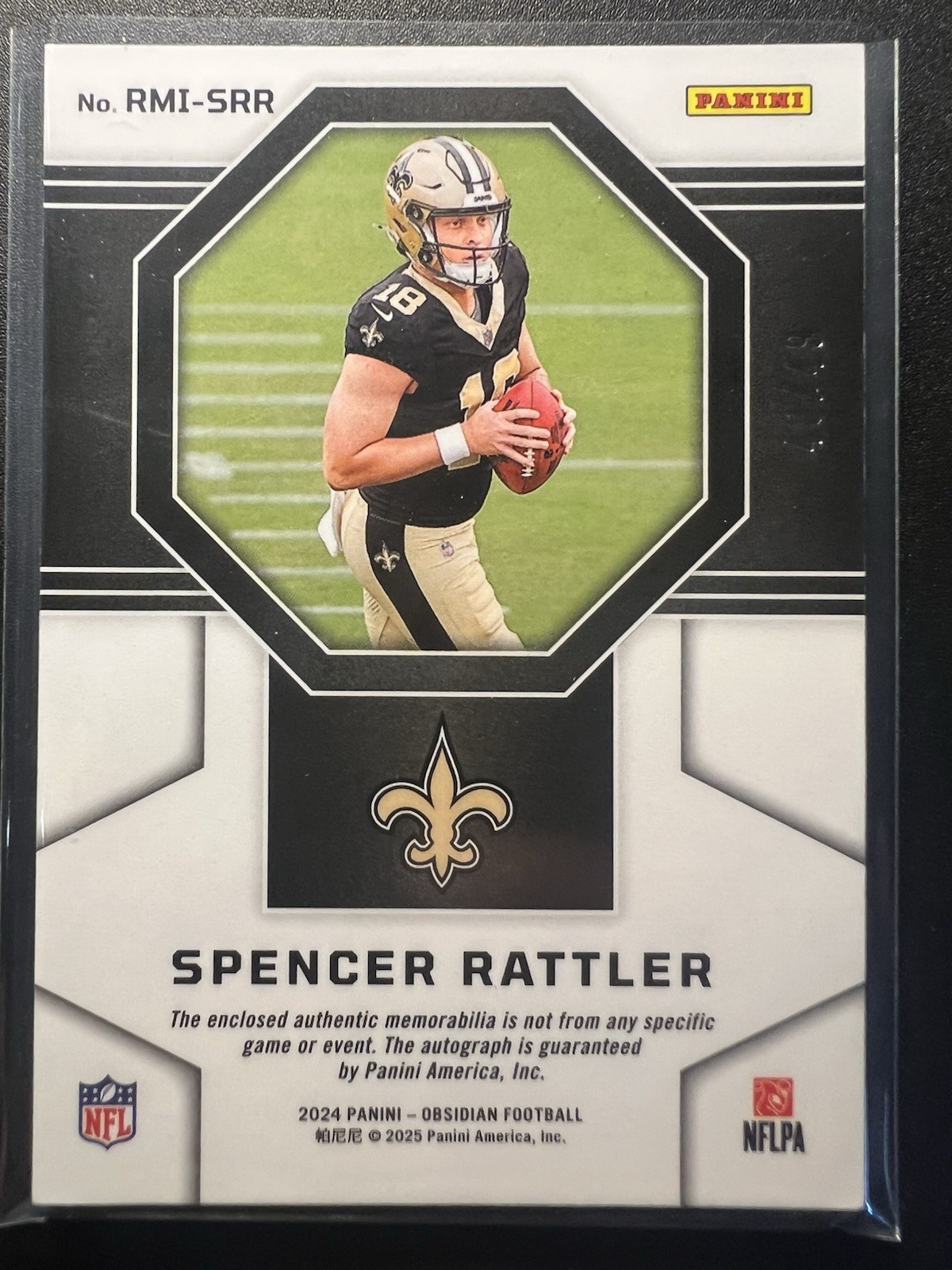This card is a must-have for any serious collector! The Deep Sea Mojo design looks stunning, and the on-card autograph from Spencer Rattler makes it even more special. The patch adds a cool game-used element, and with only 49 copies out there, it’s a rare gem. Perfect for Saints fans or anyone chasing exclusive rookie cards—definitely a standout in the 2024 Obsidian set!