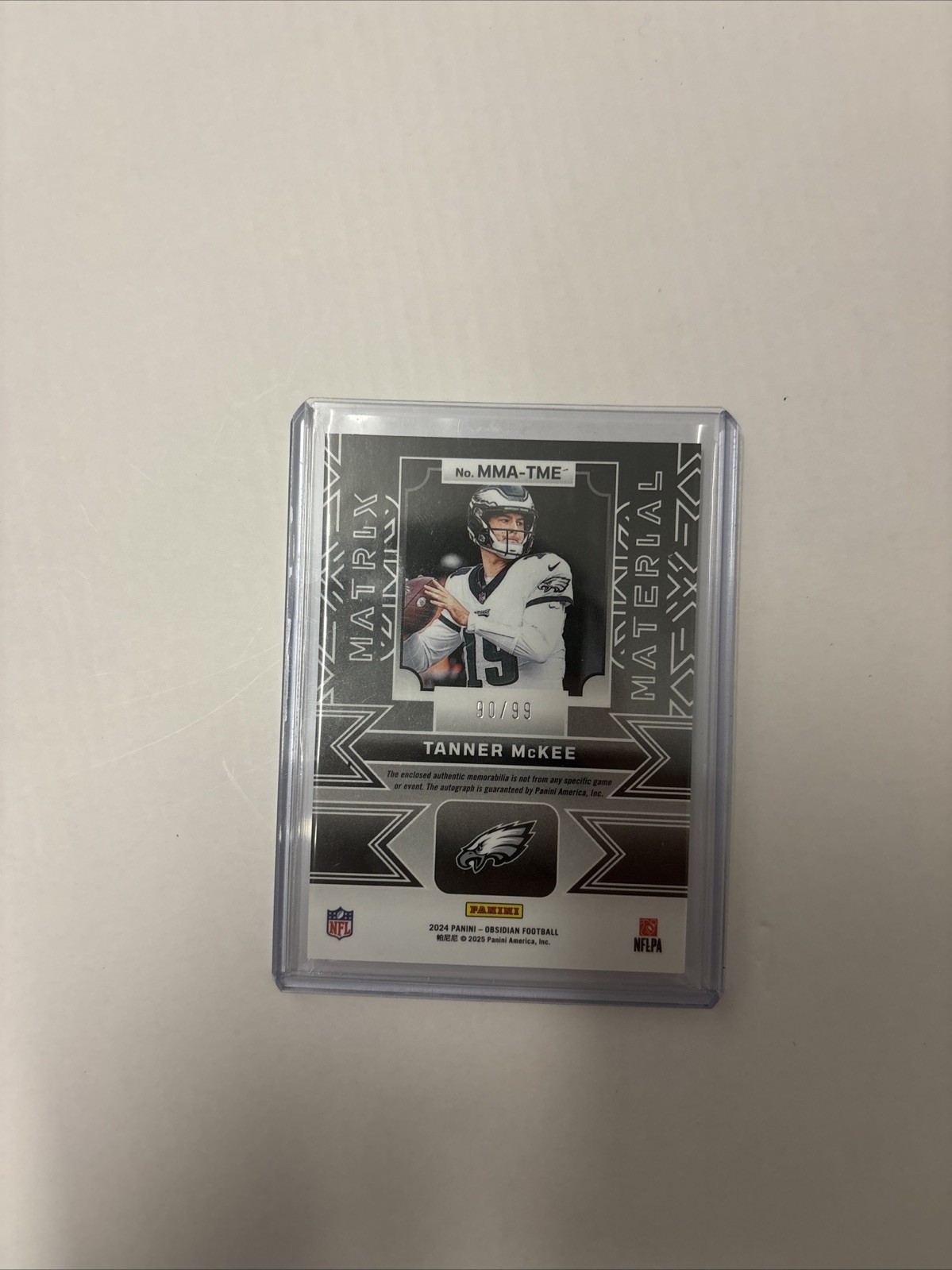 Elevate your football card collection with the 2024 Panini Obsidian Tanner McKee Matrix Material Auto Patch Silver /99. A standout piece from the Obsidian set, this card features a striking Prizm parallel that catches the light, showcasing the athleticism and potential of NFL star Tanner McKee. Crafted with quality in mind by Panini, this card is a must-have for fans and collectors alike. The limited-edition silver variant is numbered to just 99, making it a valuable and rare addition to any collection. With its eye-catching design and premium construction, it's a true tribute to the sport and its rising talents.