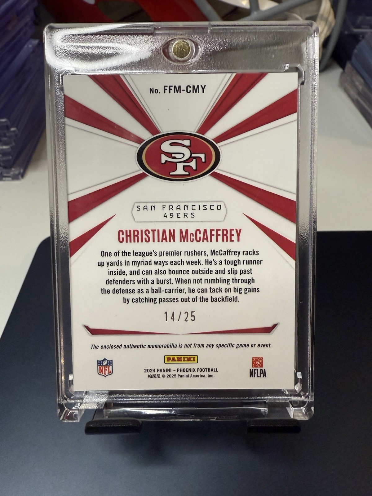 The product is a 2024 Panini Phoenix Franchise Future Material trading card featuring Christian McCaffrey of the San Francisco 49ers. This card is a limited edition with a print run of only 25, making it highly sought after by collectors. It is a green parallel variety card made by Panini, with features like being serial numbered, an insert, and containing memorabilia. This rare card is a valuable addition to any football card collection.
