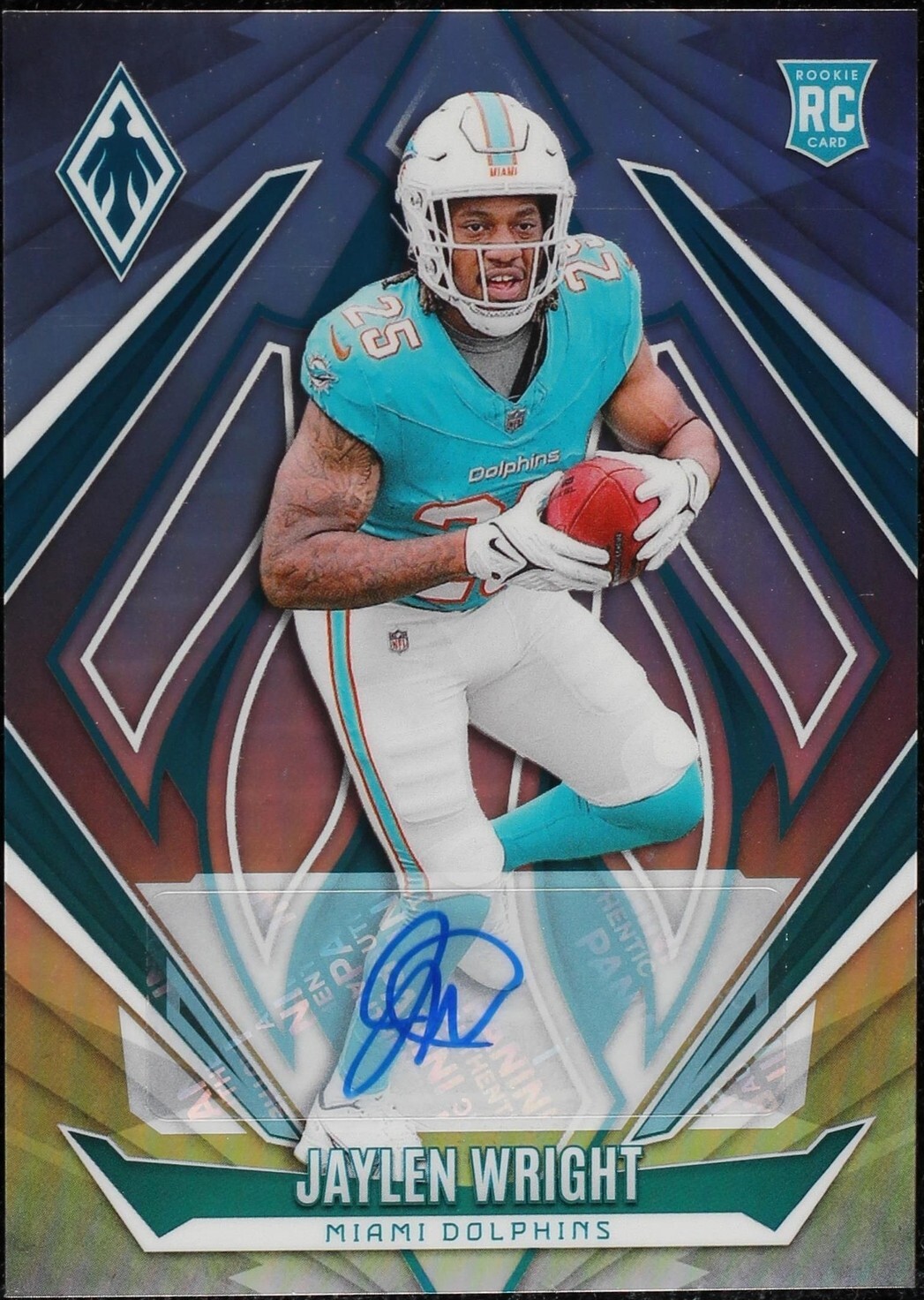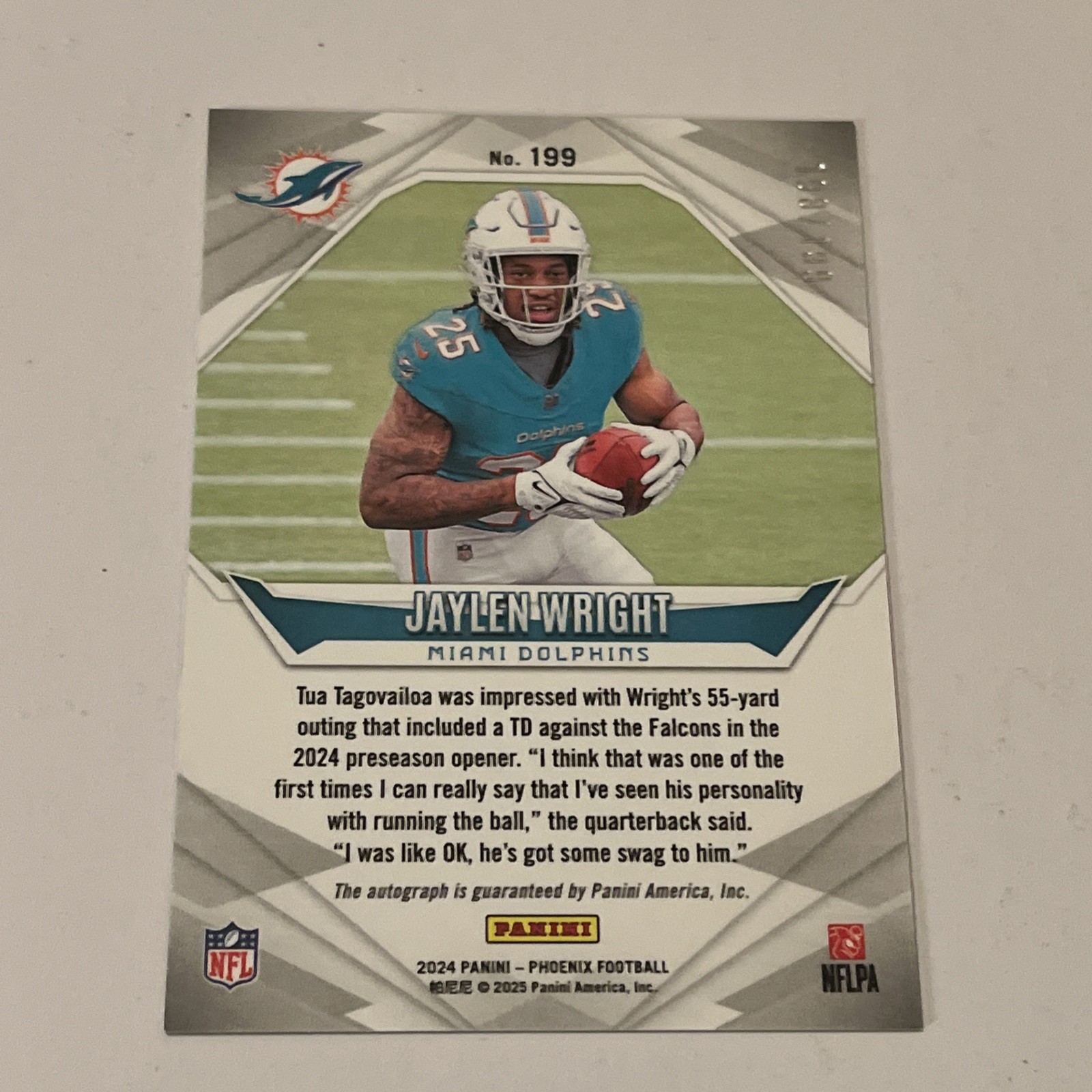 The 2024 Panini Phoenix Rookies Jaylen Wright #199 Silver Autograph /199 trading card is a highly sought-after collectible item for football fans and card enthusiasts. This limited edition card features an autograph from Jaylen Wright, signed on a label or sticker, making it a valuable addition to any collection. With a print run of only 199, this card is a rare find and a must-have for fans of the National Football League (NFL) and the Miami Dolphins team. Its unique design and serial numbering add to its appeal, making it a standout piece for any football card collector.