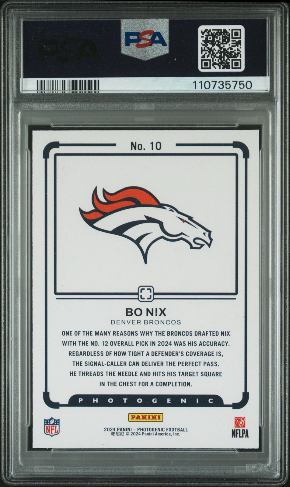 The product is a 2024 Panini Photogenic Draft Snapshots trading card featuring rookie football player Bo Nix from the Denver Broncos. Limited to a print run of only 25, this card is a valuable collectible for fans of the National Football League. With high-quality photography and exclusive design, this card is sure to be a prized possession for any collector of sports memorabilia.