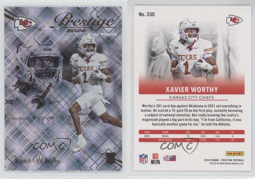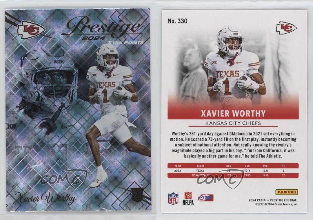 2024 Panini Prestige - [Base] - Xtra Points Diamond #330 Rookies - Xavier Worthy - RC (Rookie Card) - Football Card - Featuring the Kansas City Chiefs and Texas Longhorns - Featuring Xavier Worthy Search for more: 2024 Panini Prestige Search for more: 2024 Panini Prestige - [Base] - Xtra Points Diamond View all of our Listings Auctions Buy It Now About Us Located in the beautiful Pacific Northwest, COMC (Check Out My Cards) is the world's largest consignment service for trading card singles. More than 10,000 people have used our consignment service to list over 50 million trading cards. Find out how we can help you consign your items on eBay by contacting us through eBay messaging. COMC -- "The Safe & Easy Way to Buy & Sell" Representative Image - Select Specific Item above to see image of actual item Representative Image - Select Specific Item above to see image of actual item Raw Condition for Modern Cards Unless otherwise noted, raw modern cards are listed in Near Mint-Mint condition or better. A NM-MT card appears to be Mint at first glance, but upon closer inspection, may exhibit some of the following: minor print defects (e.g. roller marks, print line, dimple), minor scratches, slight edge wear, and slight corner wear. Centering is clearly visible in the images provided and does not factor into our condition assessment. Raw Condition for Vintage Cards Unless otherwise noted, raw vintage cards are listed in Excellent condition or better. An EX card may exhibit some of the following: minor rounding of corners, surface wear, print defects, light scratches, and slight edge wear/chipping. Centering is clearly visible in the images provided and does not factor into our condition assessment. Domestic Shipping Combined shipping for multiple items is available. To receive combined shipping, please ensure all desired items are in your eBay shopping cart before proceeding to checkout. eBay limits orders to 40 items per order. We automatically combine multiple orders placed on the same day. If you place multiple orders on the same day, please contact us to request a refund of applicable shipping costs. Signature confirmation may be required on invoices over $400. All cards are protected and shipped securely. International Shipping COMC offers eBay's International Shipping (EIS) for international orders under $2,500* (see country exceptions below). All duties and import fees are paid at checkout; in the rare event that there are additional import fees upon delivery, these are borne by the buyer. EIS packages route through a shipping hub in Erlanger, KY before shipping to their final destination. Please note that EIS does not allow for combined shipments. The shipping rates are determined by eBay and cannot be adjusted. *Maximum sale price exceptions: Colombia, Kuwait ($2,000); Taiwan ($1,539); Chile, Costa Rica, Guatemala, Honduras, Trinidad and Tobago ($1,000); Antigua and Barbuda, Aruba, Belize, Dominica, Grenada, Philippines, Saint Kitts and Nevis, Saint Lucia, Montserrat, Turks and Caicos Islands ($500); Dominican Republic, El Salvador ($200). Please request a shipping quote through eBay messaging for orders that exceed the maximum sale price supported by eBay's International Shipping. You will be responsible for all duties and import fees for international orders shipped outside the EIS. All cards are protected and shipped securely. Payment COMC does not accept offers on our cards through our eBay storefront. COMC utilizes eBay’s managed payments system. If you are experiencing difficulties making a payment, please contact eBay for assistance. Return Policy Returns are only accepted on the rare occasion the item is not as described. If you are making a return, please initiate the return process through eBay so a mailing label can be provided for you. Prior to listing, our expert team carefully assessed this item to represent it accurately. Please review the description and high-definition images prior to purchasing to ensure this item meets your satisfaction. We welcome you to contact us if you have further questions about this item. Trust and Integrity COMC carefully assesses each item consigned to us to prevent fraudulent items from entering the marketplace. If you believe an item offered on COMC may be fraudulent, please contact us with details so we can investigate the issue. Items we determine are outside our supported items policy may be removed. Last Modified: 7/4/2025 1:40:15 AM PDT