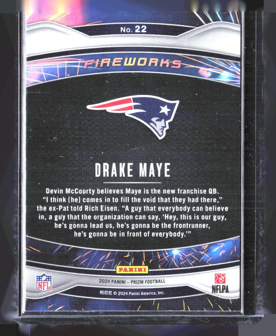Season: 2024 League: NFL Language: English Manufacturer: Panini Card Name: 2024 Panini Prizm #22 Drake Maye Fireworks Type: Sports Trading Card Autographed: No Set: 2024 Panini Prizm Sport: Football Year Manufactured: 2024