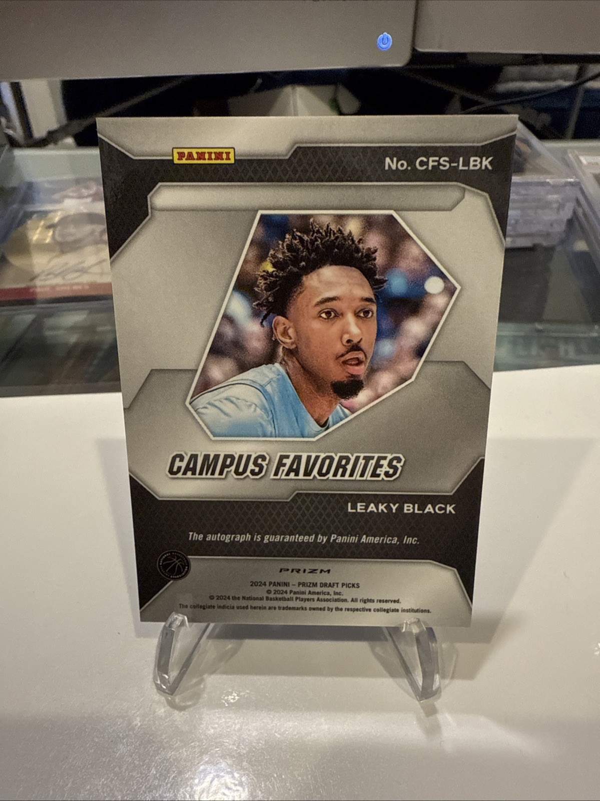 The product is a 2024 Panini Prizm sports trading card featuring Leaky Black from the North Carolina Tar Heels basketball team. This card is part of the Campus Favorites subset and is a Silver parallel variety with an autograph from the player. It is a sought-after collectible item for fans of college basketball and sports trading cards, showcasing Leaky Black in his UNC uniform.