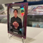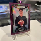 The 2024 Panini Prizm Draft Picks #193 Julian Sayin Purple Rated Rookie card features Julian Sayin of the Ohio State Buckeyes in a National Collegiate Athletic Association (NCAA) Football League design. This sports trading card is a limited edition Purple Prizm parallel variety with a print run of only 75, making it a rare find for collectors. It is a serial-numbered rookie card from the 2024 season, manufactured by Panini, and is a desirable addition to any sports trading card collection.