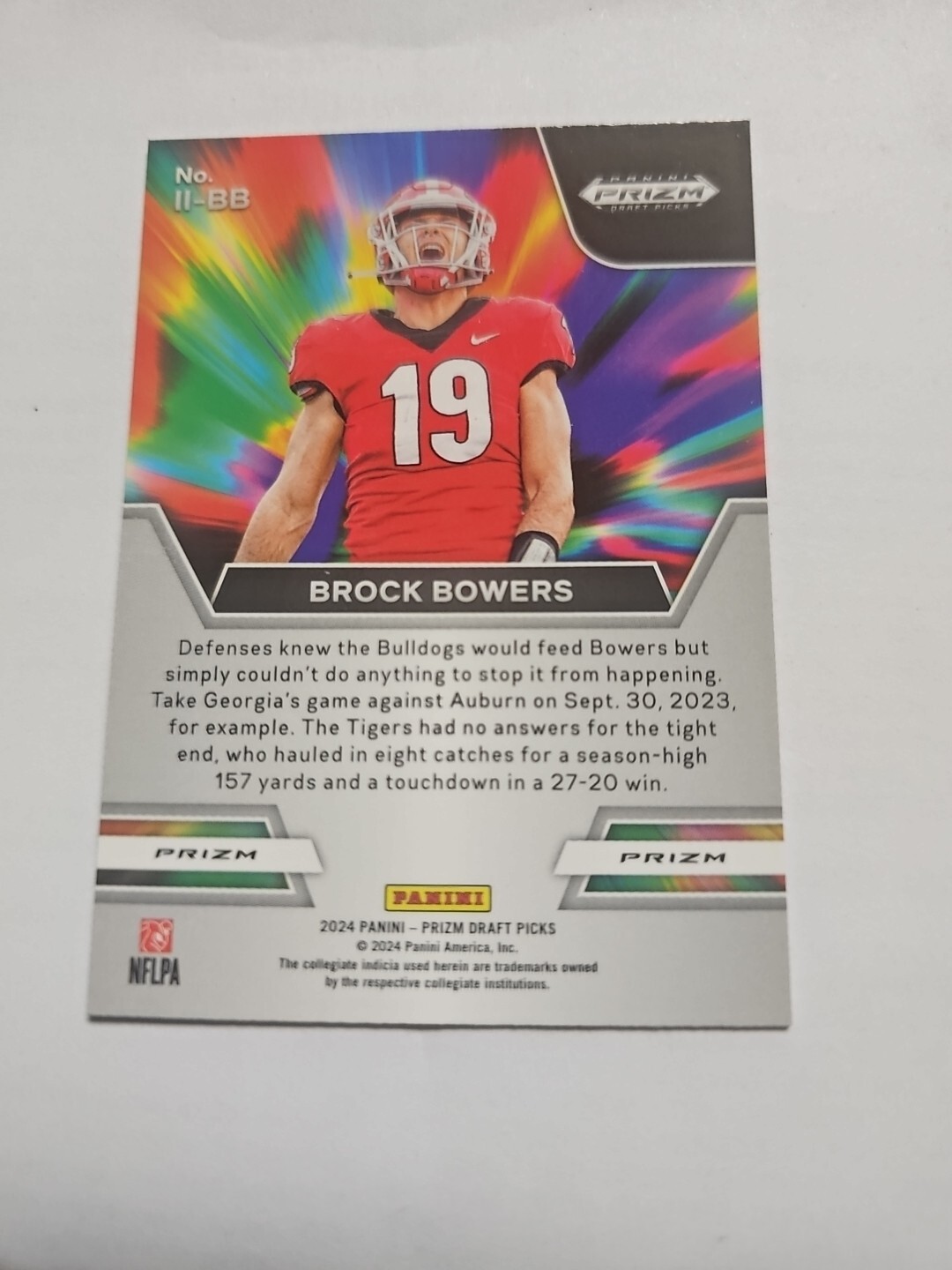 Team:Georgia BulldogsOriginal/Licensed Reprint:OriginalCard Condition:Near Mint or BetterAutographed:NoVintage:NoFeatures:RookieGraded:NoLeague:National Collegiate Athletic Association (NCAA)Sport:Football, BasketballSeason:2024Year Manufactured:2024Manufacturer:PaniniMaterial:Card StockCountry/Region of Manufacture:United StatesParallel/Variety:GreenType:Sports Trading CardPlayer/Athlete:Brock Bowers