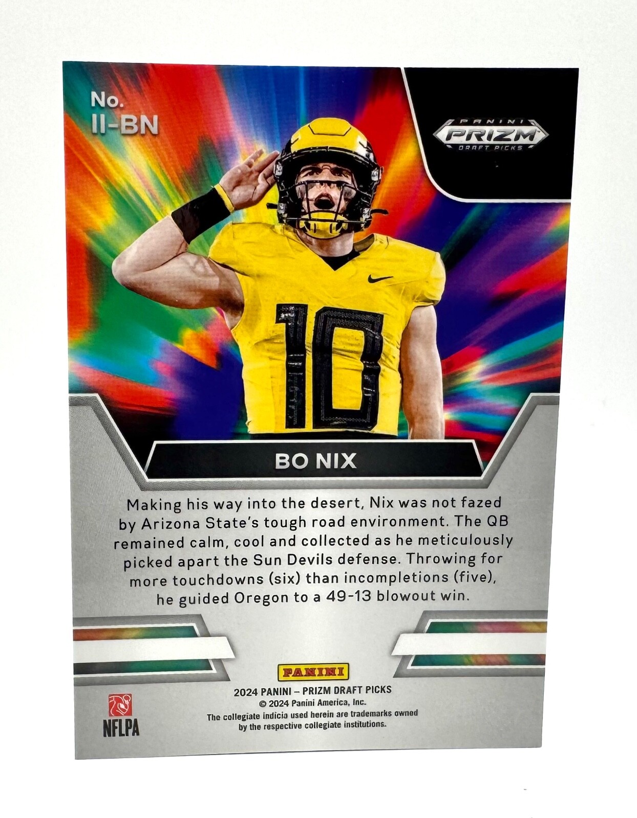 Capture the excitement of collegiate football with the 2024 Panini Prizm Draft Picks - Instant Impact #II-BN Bo Nix rookie card. This collectible features Bo Nix, the promising talent from Oregon Ducks, and is a must-have for fans and collectors alike. The Prizm parallel variety adds a shimmering finish that enhances the card's visual appeal, making it a standout addition to any collection. As part of the coveted 2024 Panini set, this card is numbered II-BN and represents the intersection of quality and prestige. Manufactured by Panini, known for their exceptional sports memorabilia, this card showcases the player in vibrant detail, celebrating the NCAA football season with finesse. Add this gem to your lineup and honor Bo Nix's burgeoning career.