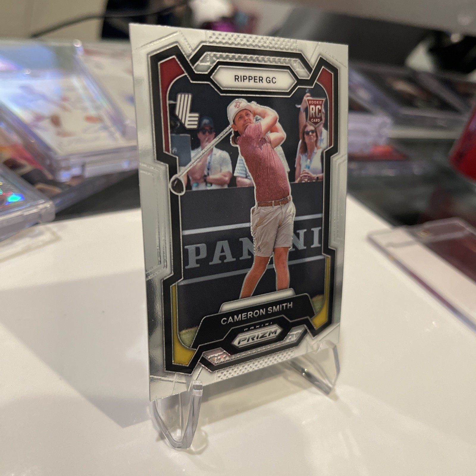 Capture the spirit of the green with the 2024 Panini Prizm LIV Golf Cameron Smith Rookie Prizm RC #39, an essential addition to any golf enthusiast's collection. This card celebrates Cameron Smith's impact in LIV Golf, highlighting his debut season with Ripper GC. The Prizm parallel variety adds a shimmering finish, making it a standout piece. Collectors will appreciate the card's fine detailing and the quality craftsmanship from Panini, a trusted name in sports memorabilia. The card is standard-sized, manufactured in the United States, and presents in English. It's a contemporary collectible that reflects the essence of the sport and its rising stars.