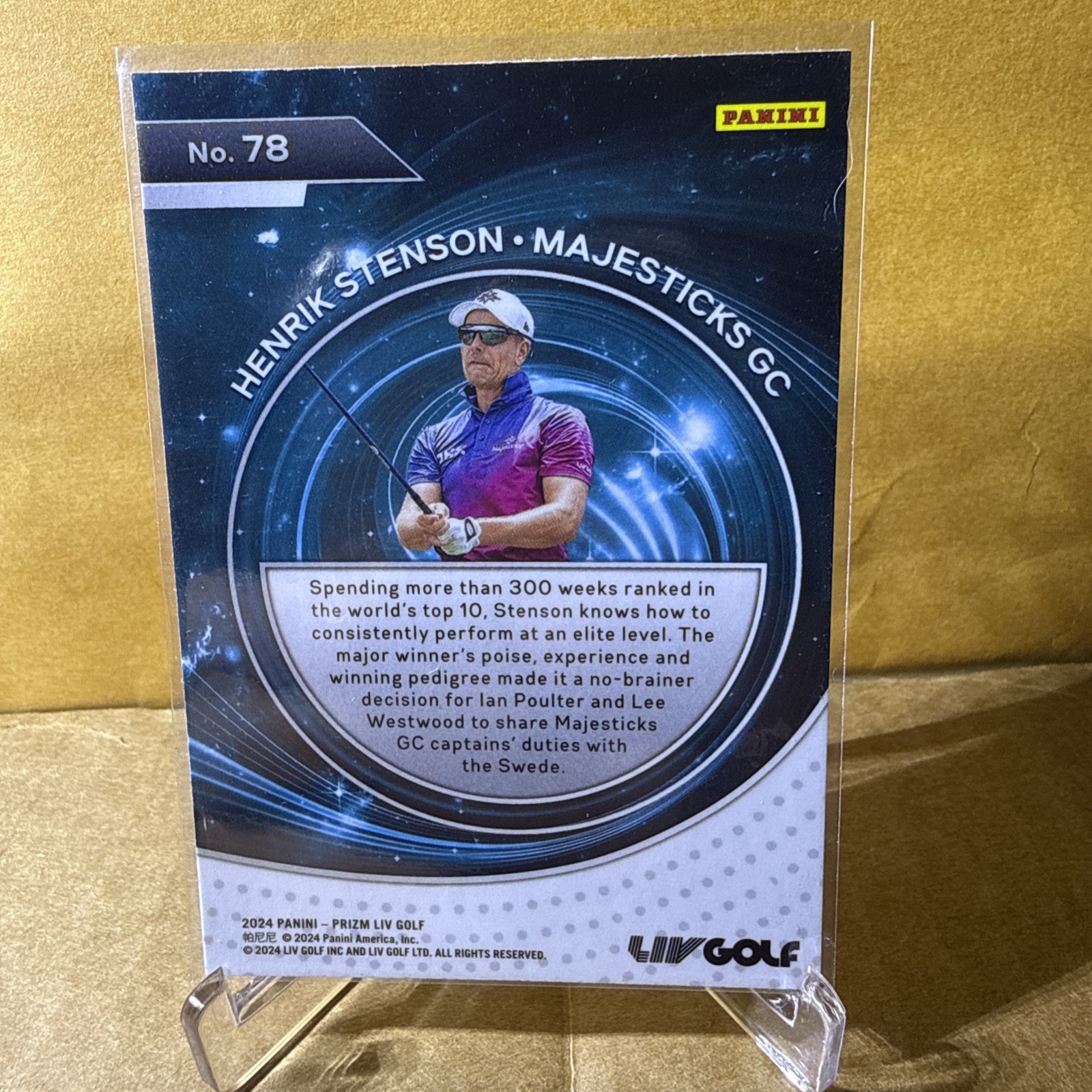 The 2024 Panini Prizm Liv Golf trading card featuring Henrik Stenson as a captain is a highly collectible item for golf enthusiasts. This particular card, numbered #78, is part of the base set for that season and manufactured by Panini. With its focus on showcasing top golf players like Stenson, this card is sure to be sought after by fans and collectors alike for its unique design and association with a renowned athlete in the sport of golf.