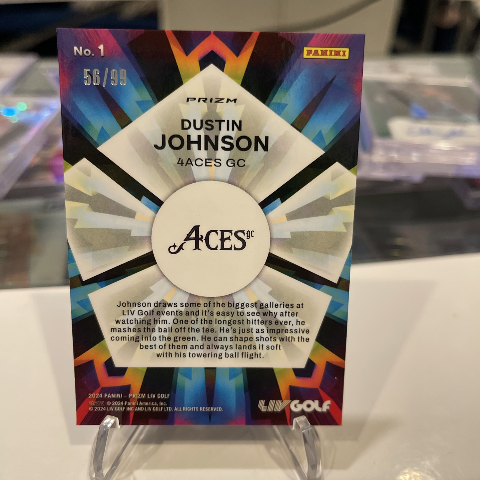 Elevate your collection with the 2024 Panini Prizm LIV Golf Dustin Johnson Blue Kaleidoscopic card. A limited edition piece with a print run of just 99, this trading card is a standout with its unique Blue Kaleidoscopic parallel and the prestige of featuring a prominent player from the USA Aces team. Expertly manufactured by 2024 Panini Prizm Liv Golf, this card is a treasure for golf enthusiasts and collectors alike. It includes notable features such as a serial number, adding to its exclusivity, and comes from a season that marks a significant moment in professional golf. Whether you're looking to commemorate the career of Dustin Johnson or simply appreciate the art of the sport, this card is a remarkable keepsake.