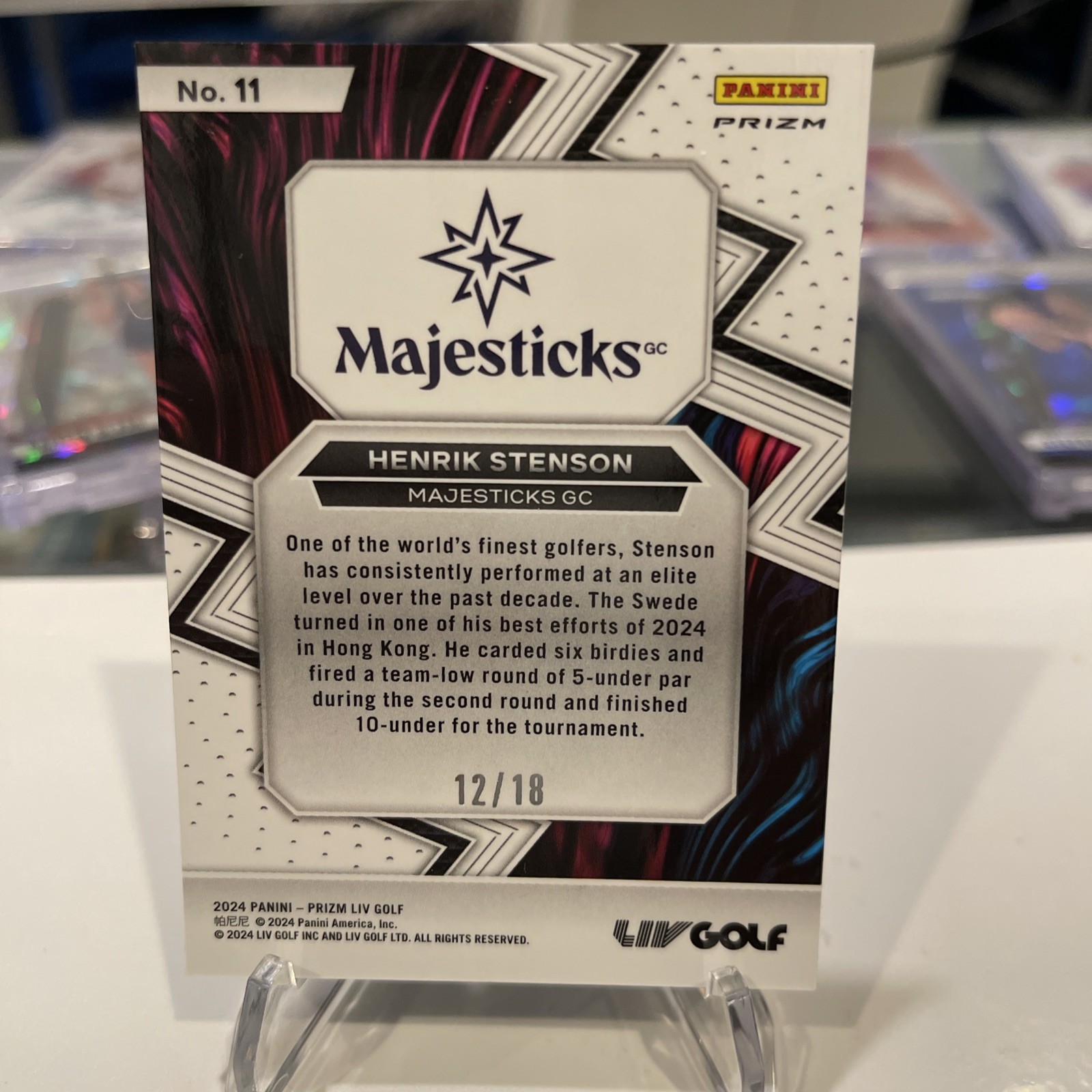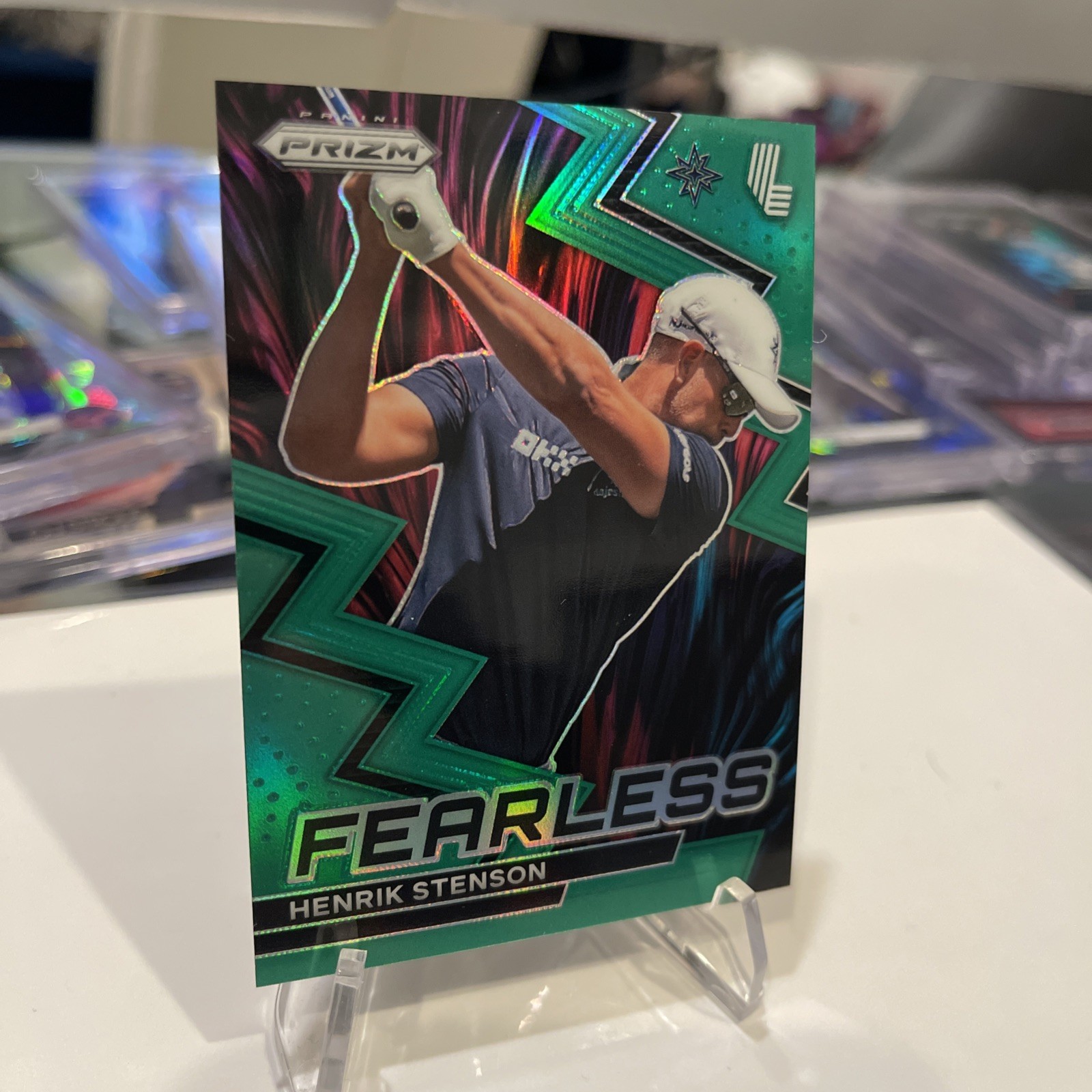 Elevate your collection with the 2024 Panini Prizm LIV Golf Fearless #11 Henrik Stenson Green Prizm card. This sought-after sports trading card features Henrik Stenson of the Cleeks, Smash team, captured in a dynamic design that showcases his prowess on the course. With a limited print run of just 18, this card is a rare find for enthusiasts and collectors alike. Crafted with quality card stock and measuring a standard size, this card is part of the esteemed 2024 Panini Prizm set. It is an original issue from the United States, highlighting the LIV Golf Tour season in 2024. Serial numbered and presenting a Green Prizm parallel, this card is a standout piece that promises to be the centerpiece of any collection.