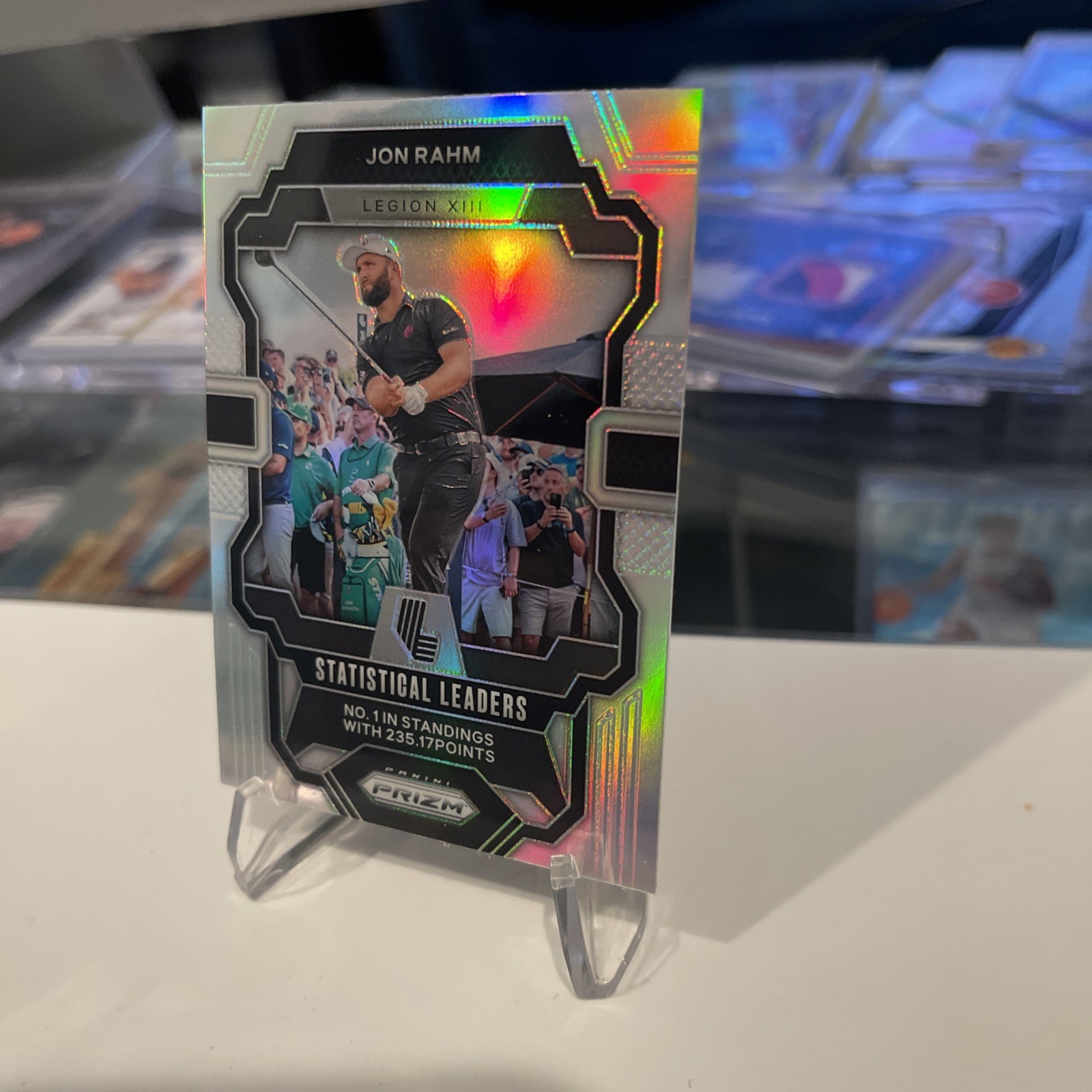 Elevate your collection with the 2024 Panini Prizm LIV Golf Jon Rahm Statistical Leader #1 SILVER 🔥 Legion XIII card. This striking silver prizm variant is a testament to Rahm's dominance on the course, featuring the impeccable quality and design that collectors and fans of the sport have come to expect from Panini. As part of the coveted 2024 Panini Prizm set, this card is a must-have for enthusiasts of professional golf and sports memorabilia. Emblazoned with the Legion XIII team insignia and card number 99, this trading card is not autographed, ensuring the focus remains on the pristine representation of Rahm's athletic prowess. Whether you're a seasoned collector or a new fan of the Professional Golfers' Association (PGA) and Pro Golf Tour, this card captures the spirit of the sport and the excellence of its players.