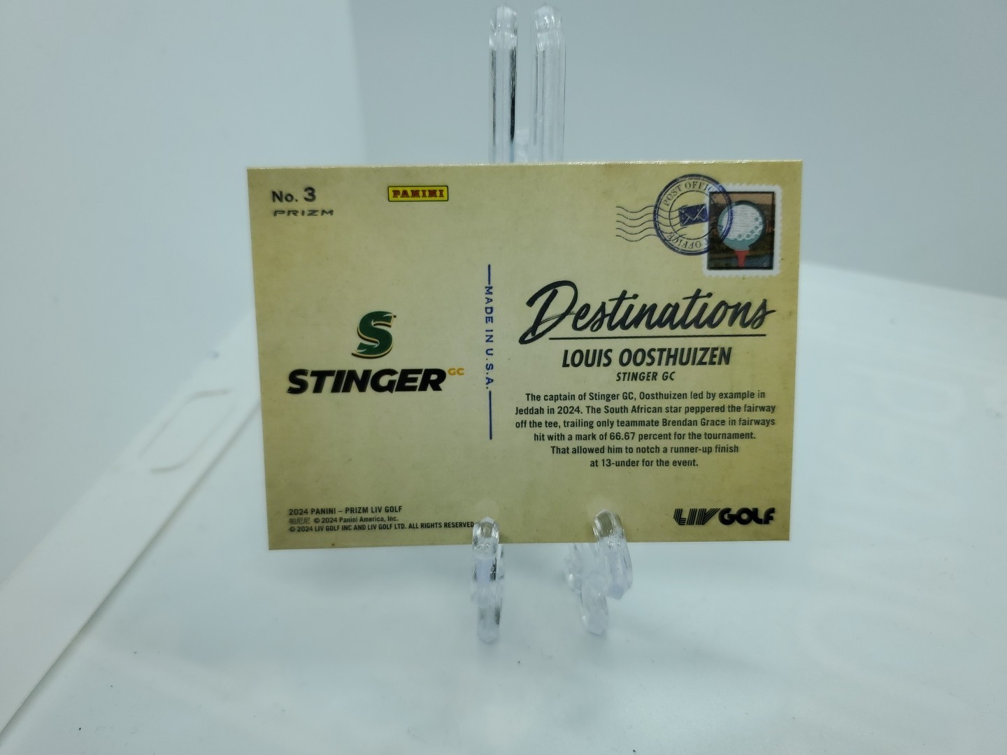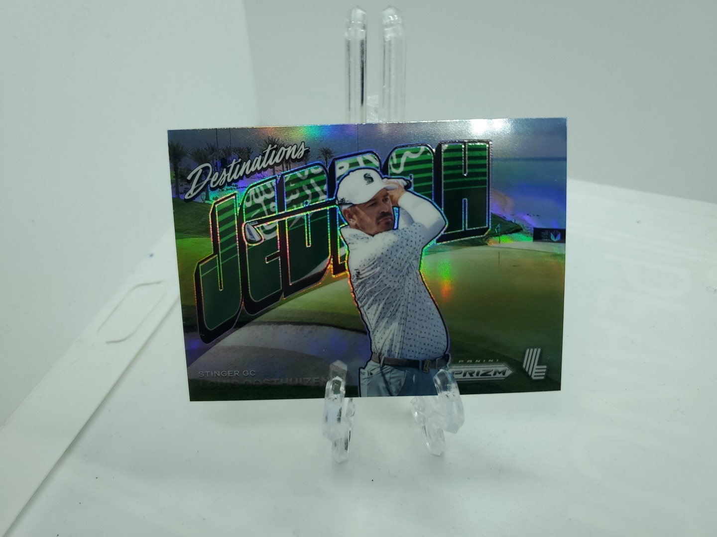 The product is a 2024 Panini Prizm golf trading card featuring Louis Oosthuizen, known as the Destinations Jeddah Prizm #3 SSP. This card is a rare short print insert within the Prizm set manufactured by Panini. It is a highly sought-after collectible for golf enthusiasts and fans of Louis Oosthuizen, with a unique design and limited availability making it a valuable addition to any sports trading card collection.