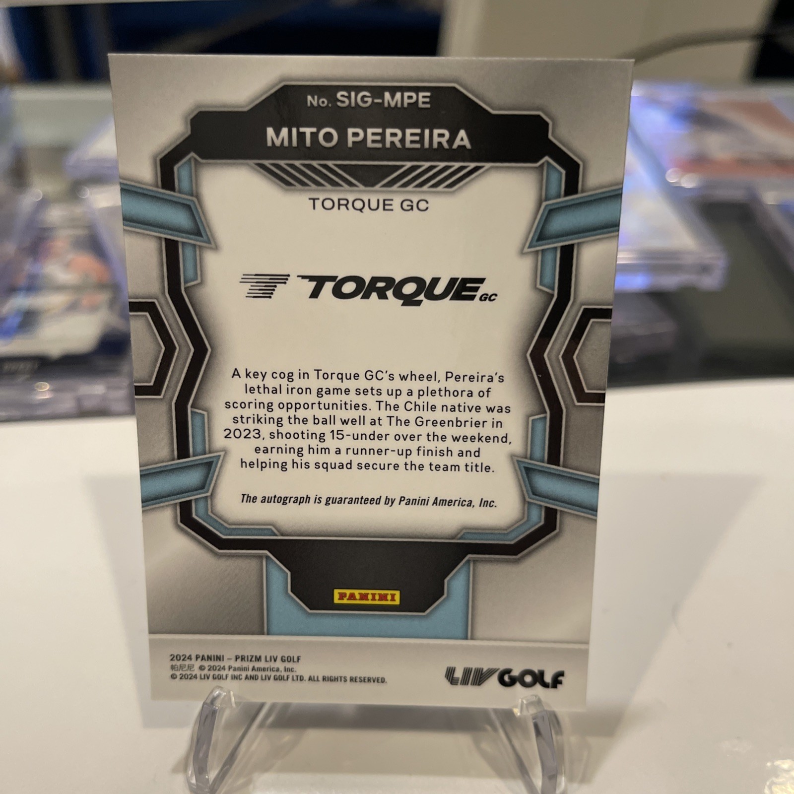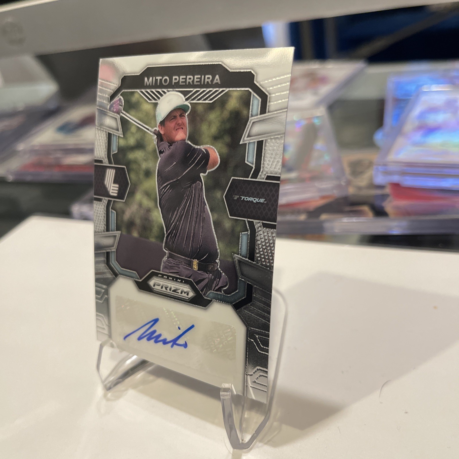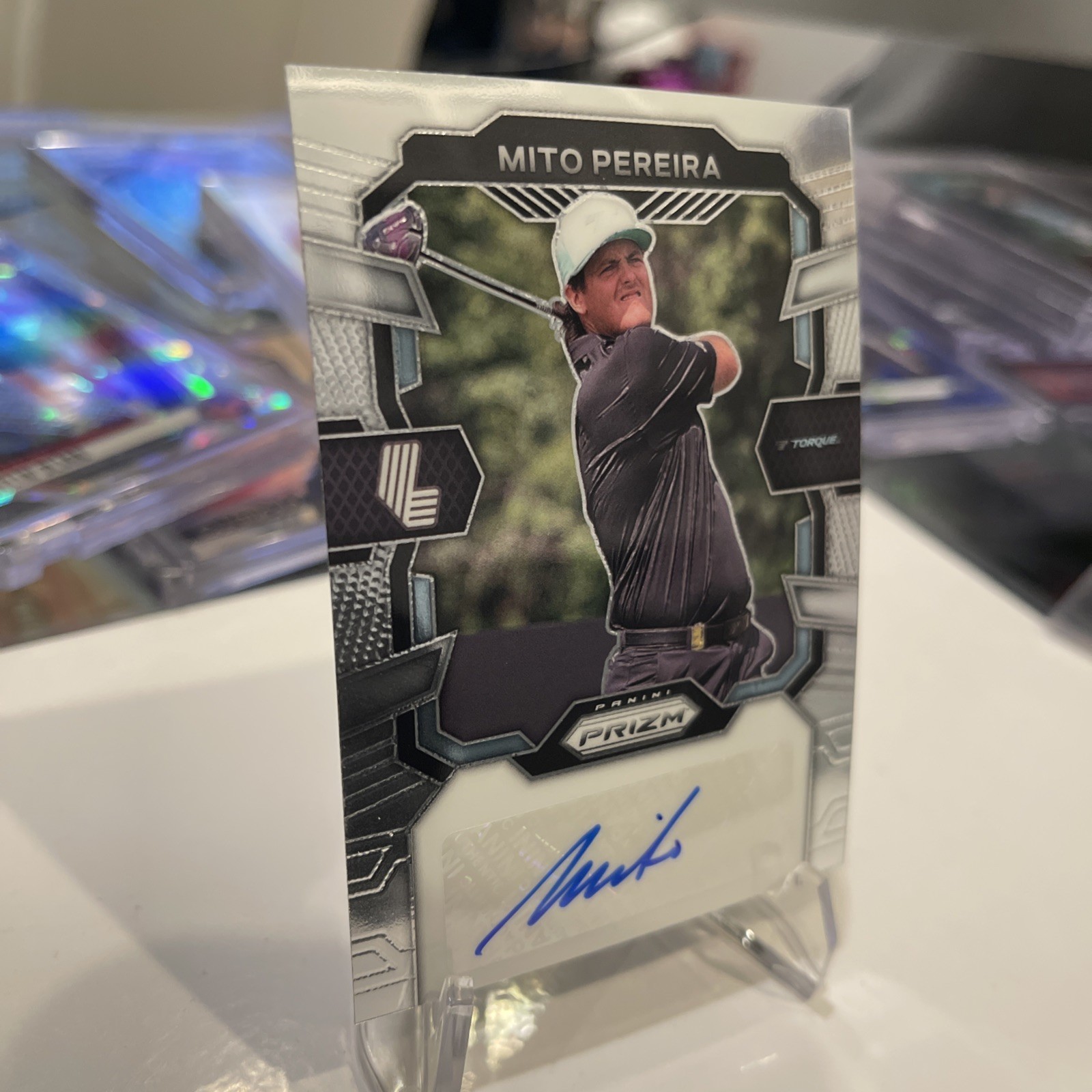 Elevate your golf memorabilia collection with the 2024 Panini Prizm LIV Golf MITO PEREIRA Auto Torque GC sports trading card. This rookie card, featuring the promising talent of Mito Pereira, is a must-have for enthusiasts and collectors alike. With its shimmering Prizm parallel variety, it's a standout piece that captures the essence of the sport and the potential of an emerging star. Autograph collectors will be delighted to find that this card is equipped with the authentic signature of Mito Pereira, adding a personal touch and increasing its value. As part of the 2024 Panini Prizm set, it's a contemporary collectible that commemorates Pereira's impressive performance within the LIV league, making it a notable addition to any sports trading card assortment.
