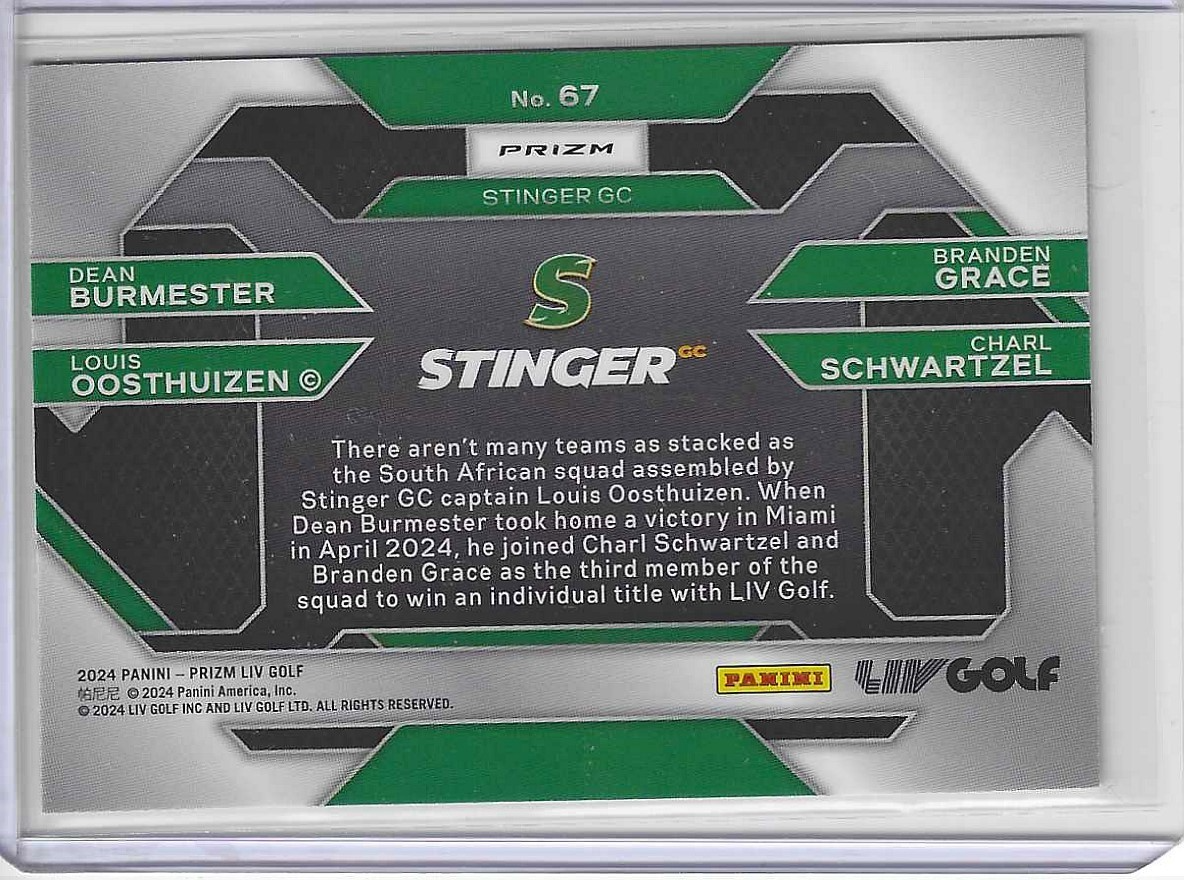The 2024 Panini Prizm LIV Golf #67 Stinger GC Team Card Silver Prizm is a sports trading card featuring Stinger GC as the player/athlete. This card is part of the 2024 Panini Prizm LIV Golf set and is a Team Card Silver Prizm variety. It is a valuable collectible for golf fans and card enthusiasts, showcasing the player in a unique and eye-catching design. This card is perfect for adding to a collection or displaying proudly as a favorite item. All cards under 20$ will be shipped in a white envelope. All cards above 20$ will be shipped in a bubble mailer. All cards will be shipped in a toploader and penny sleave. The scans of the card are of the actual card you will recieve. If you would like extra pictures, please message me and I will gladly send more.