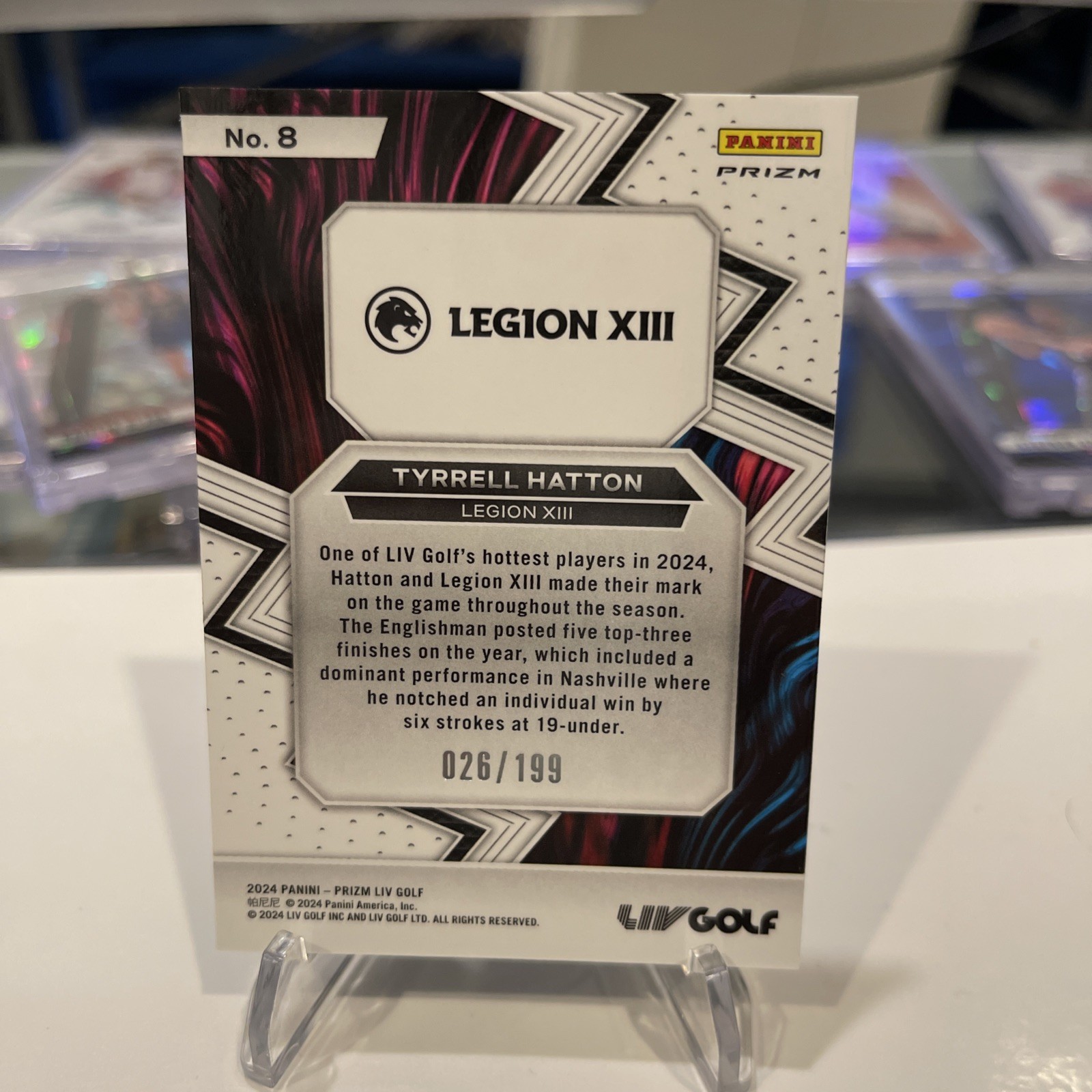 Elevate your collection with the 2024 Panini Prizm LIV Golf Fearless #11 featuring the talented Tyrrell Hatton of Legion XIII. This exclusive Teal Prizm variant, with a limited print run of just 199, captures the essence of the golfing sensation in action, making it a coveted piece for enthusiasts and fans alike. The card boasts a sleek card stock construction and standard card size, perfect for display or safekeeping. As part of the revered 2024 Panini Prizm set, this non-autographed collectible is a true original, serial numbered to ensure its uniqueness and manufactured in the United States with pride.