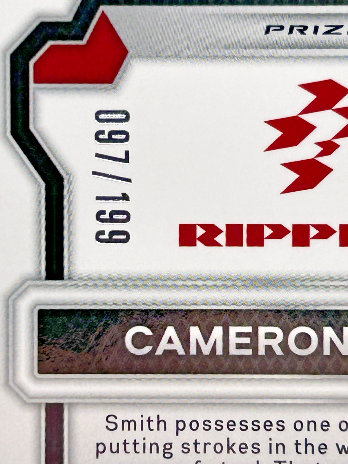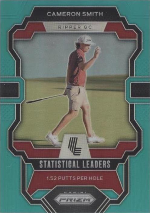 The product is a 2024 Panini Prizm Liv Golf trading card featuring Cameron Smith, a statistical leader in the Liv league. This particular card is a Teal Prizm parallel with a serial number of 157/199, making it a sought-after collectible for fans and collectors. With its rookie designation and inclusion in the base set, this card offers a unique and valuable addition to any golf trading card collection.