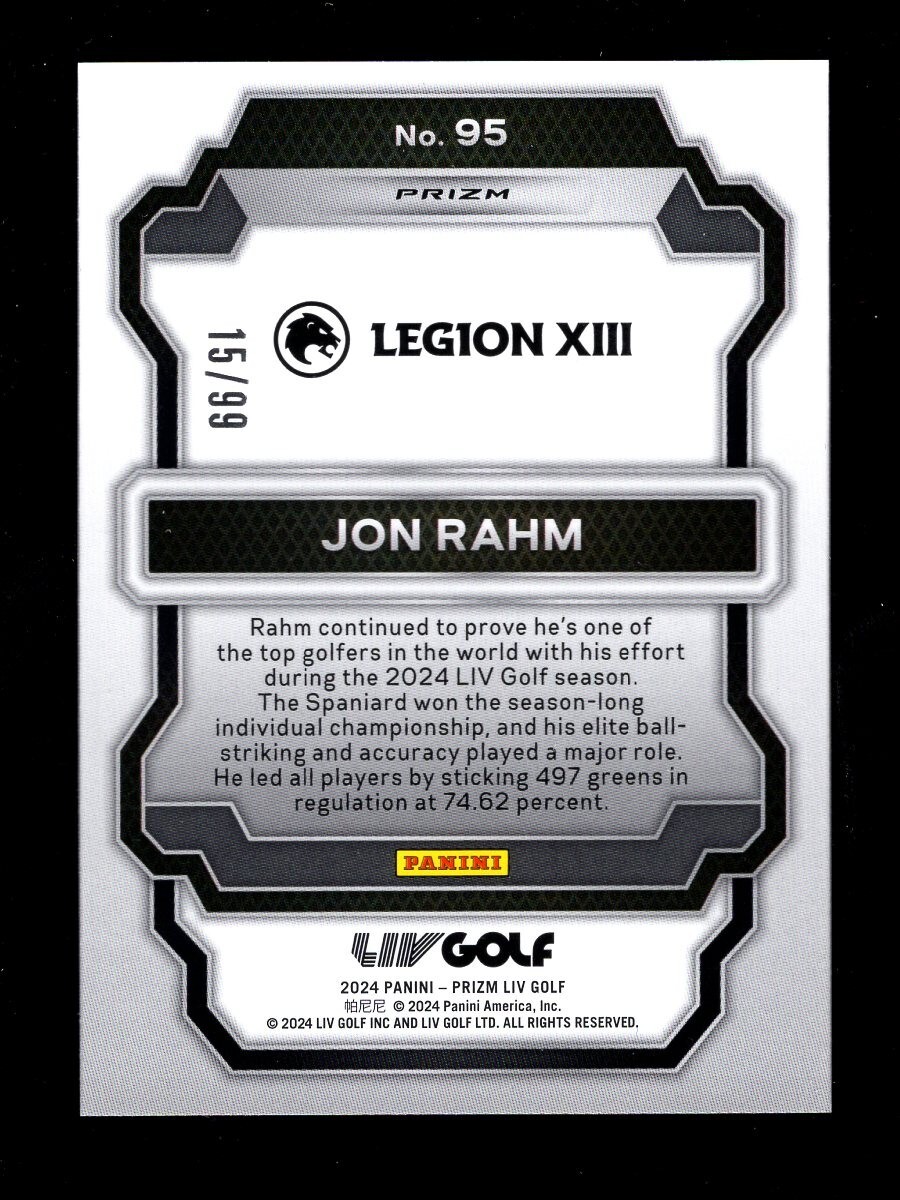Series:Panini Prizm LIV GolfFeatures:Rookie, Serial Numbered, Base Set, Parallel/VarietyAdditional Description:2024 Statistical Leaders - Jon RahmParallel/Variety:Blue PrizmPrint Run:99Set:2024 Panini Prizm Liv GolfManufacturer:PaniniSeason:2024Player/Athlete:Jon Rahmbrand:PaniniSport:GolfCard Number:95Subset:2024 Statistical LeadersLeague:Liv