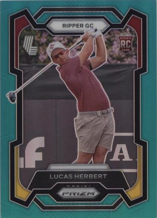 The product is a 2024 Panini Prizm Liv Golf trading card featuring Lucas Herbert, specifically the Teal Prizm parallel with a print run of 199. This rookie card is serial numbered, part of the base set, and in the league of golf. The card is a valuable addition to any sports trading card collection, especially for fans of Lucas Herbert and golf.