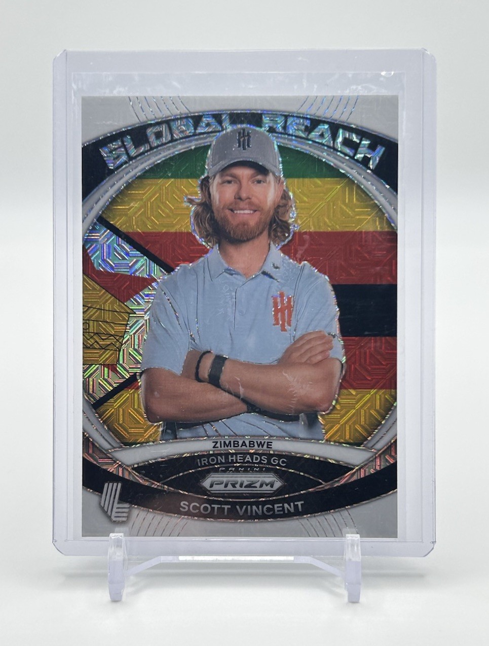 The product is a 2024 Panini Prizm Golf White Mojo rookie card of Scott Vincent, a golfer from Zimbabwe. This limited edition card has a print run of only 36 and is in near mint condition or better. It is a highly collectible sports trading card for fans of the Professional Golfers' Association (PGA) and those interested in investing in rare sports memorabilia. The card features a unique design and is a valuable addition to any golf card collection.