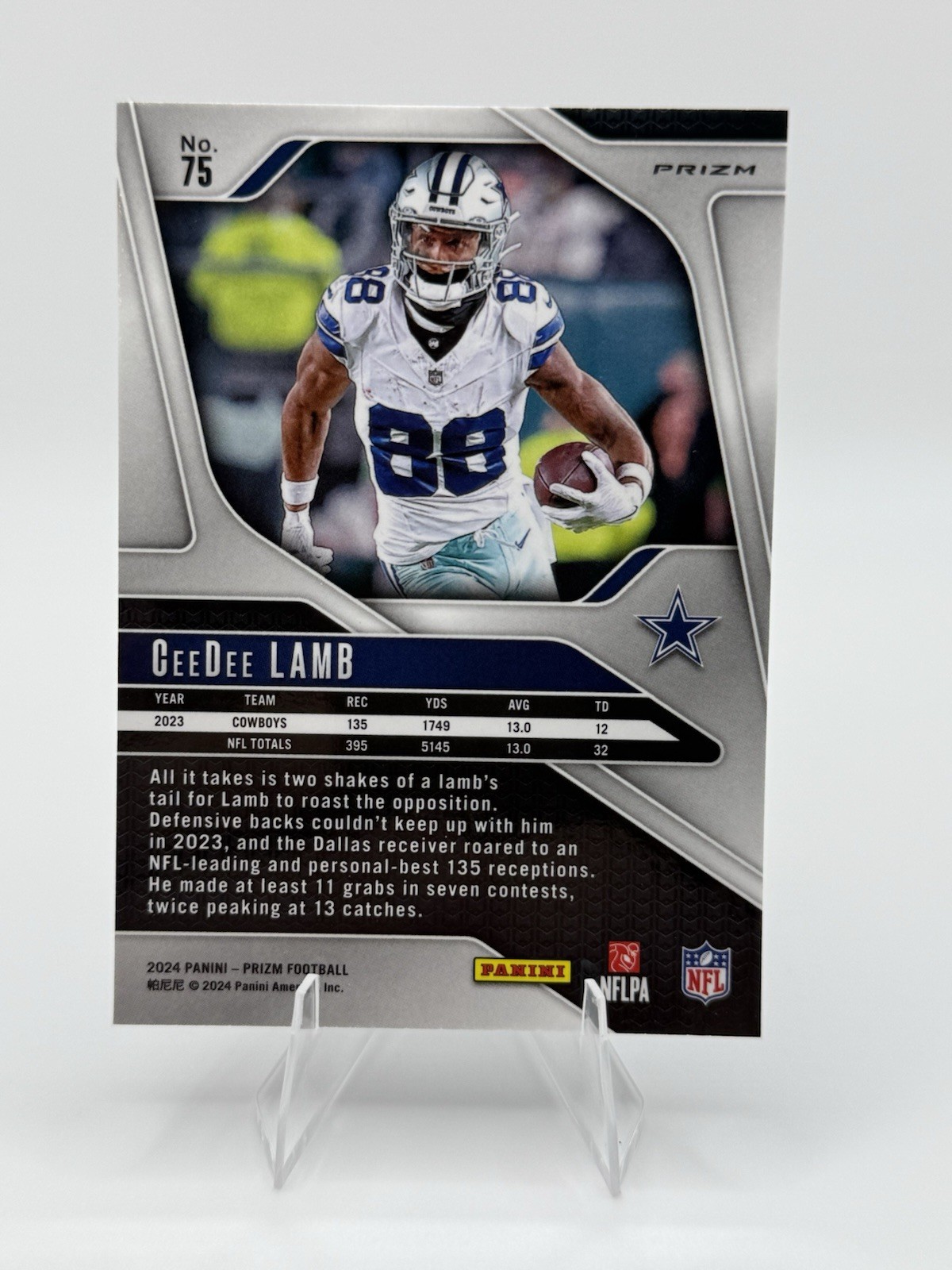 The 2024 Panini Prizm NFL Football Ceedee Lamb #75 Red White & Blue card is a standard-sized trading card featuring the player CeeDee Lamb from the Dallas Cowboys. This original card is part of the 2024 Panini Prizm Football set and is made of card stock. The Red White & Blue Prizm parallel adds a unique touch to this collectible item, making it a sought-after piece for football card enthusiasts. With its short print status and base set features, this card is a valuable addition to any sports trading card collection.