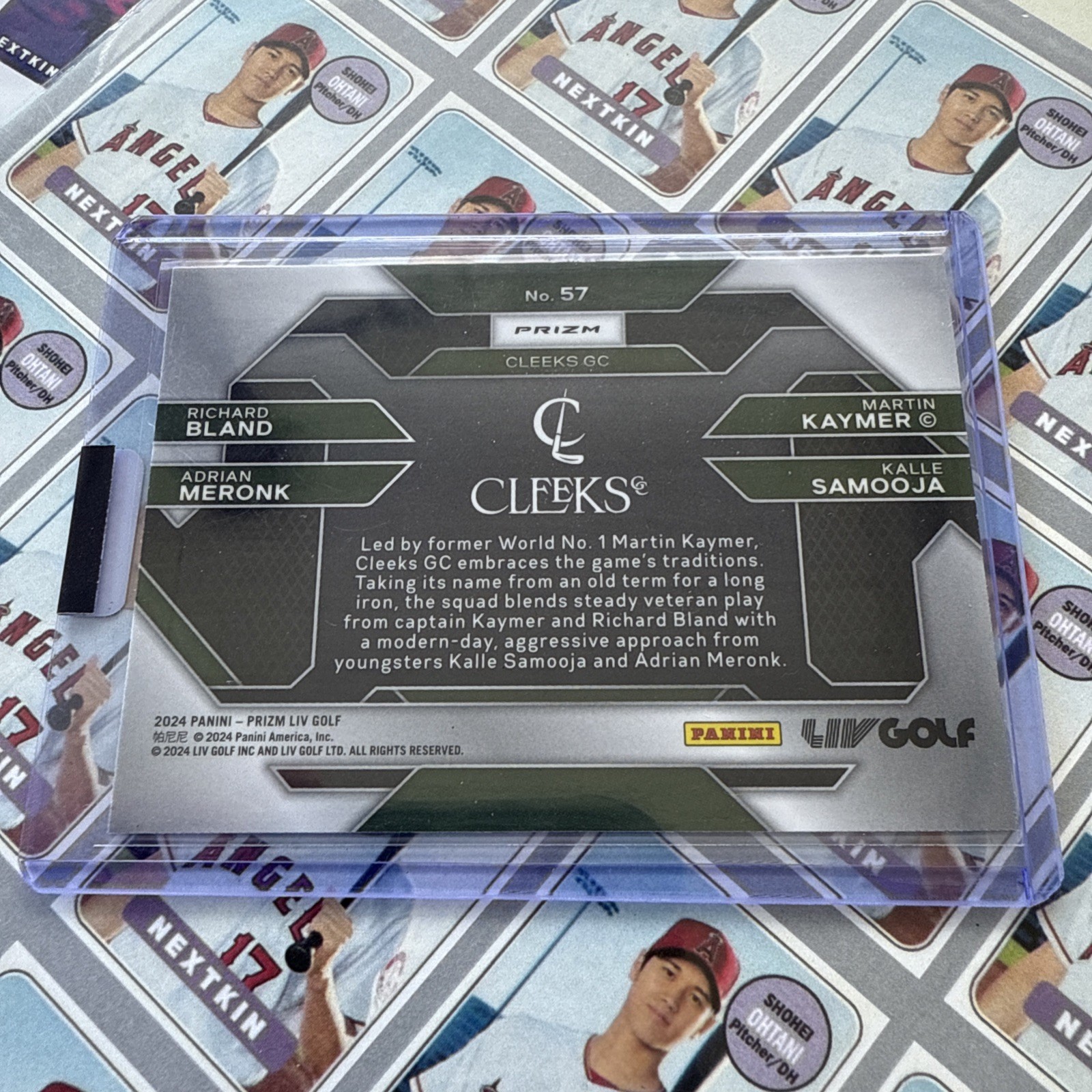 The 2024 Panini Prizm Silver Liv Golf - Team Cards Cleeks GC #57 is a standard-sized sports trading card featuring the golf player Nextkin from the LIV league. Manufactured by Panini, this original card is part of the 2024 Panini Prizm set and is made of card stock with a thickness of 20 Pt. The card is in English language and features a silver parallel variety, making it an exclusive short print. This collectible item is a must-have for fans of golf trading cards, especially those looking to add a unique piece to their collection.