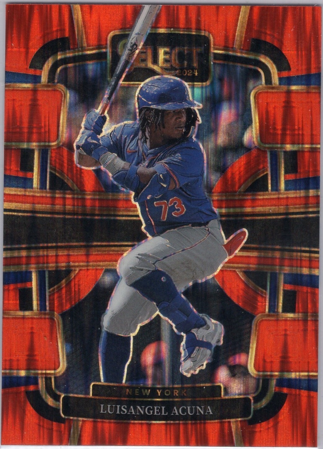 The 2024 Panini Select Concourse Luisangel Acuna #82 Orange Flash Prizm trading card is a sought-after collectible featuring the rookie player from the New York Mets. This baseball card is part of the Panini Select set, known for its exclusive designs and parallel varieties. The Orange Flash Prizm adds a shiny and colorful element to the card, making it a standout piece for any baseball card collection. With a focus on the Major League Baseball season of 2024, this card is a must-have for fans and collectors alike.