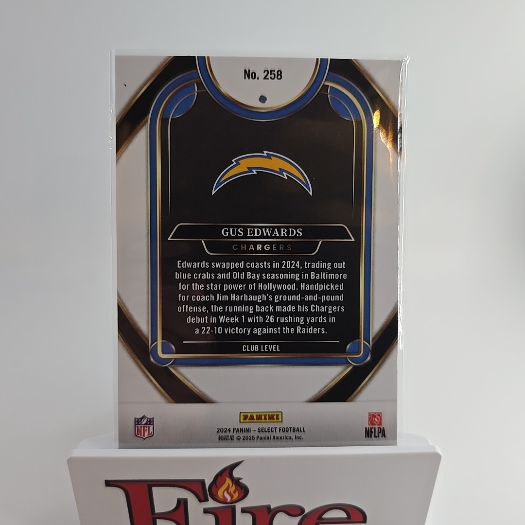 The 2024 Panini Select Football Club Level Gus Edwards #258 trading card features Gus Edwards of the Los Angeles Chargers in the National Football League. This card is part of the 2024 Panini Prizm set and is manufactured on card stock. It is an original sports trading card with a Club Level parallel variety, making it a valuable addition to any football card collection. The card showcases the player in English language, highlighting his performance during the 2024 season. Thank you for your interest, don't let it get away bid today!