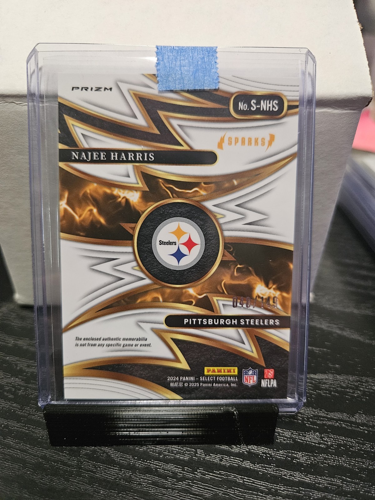 The 2024 Panini Select Football Sparks Prizm Patch featuring Najee Harris of the Pittsburgh Steelers is a limited edition trading card numbered to 149. This card is part of the 2024 Panini Select set and showcases a patch design, making it a valuable addition to any football card collection. With its standard size and focus on the National Football League, this card is a must-have for fans of the sport and collectors of sports trading cards.