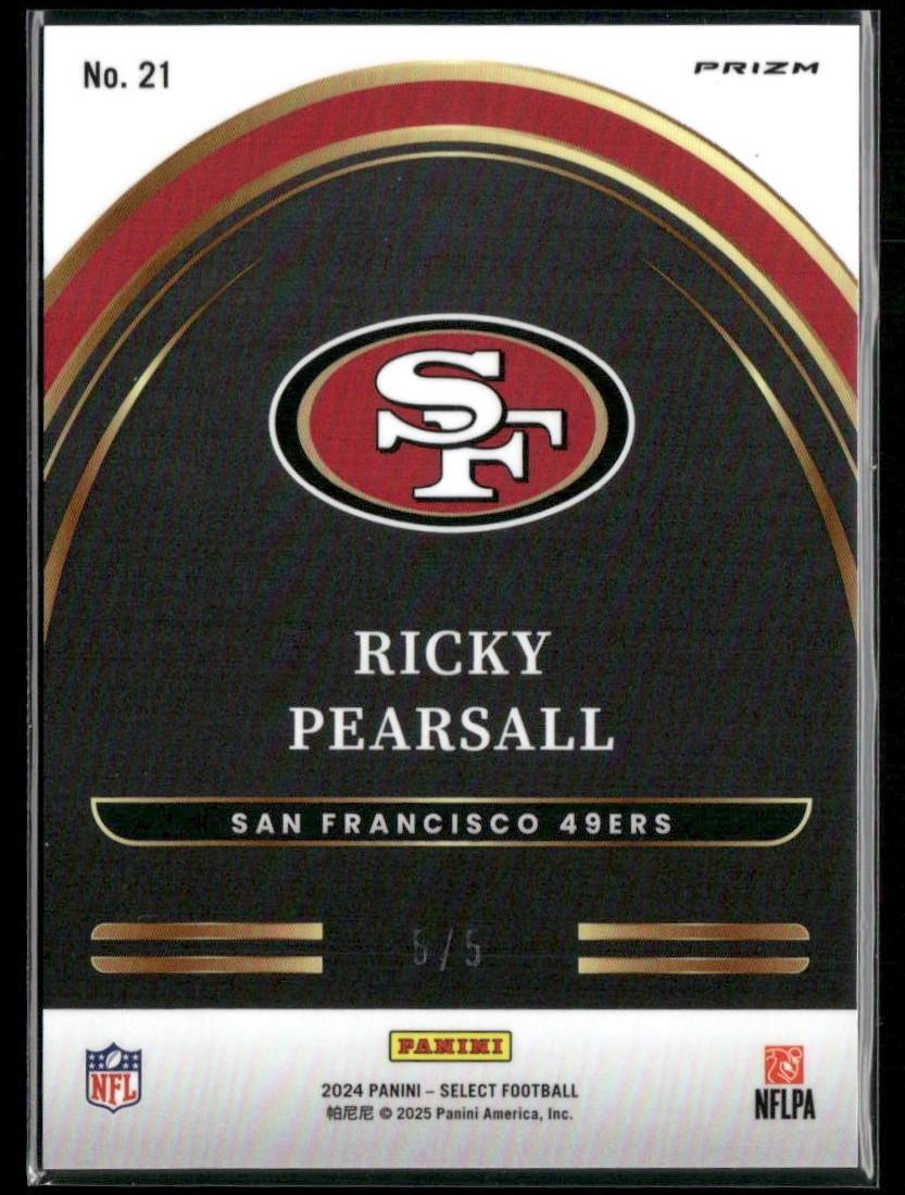 The 2024 Panini Select Future Green Prizm /5 RICKY PEARSALL (RC) #21 trading card is a rare and collectible item featuring the young football player from the San Francisco 49ers. This limited edition card is part of the Select Certified Rookies insert set and is serial numbered for authenticity. Manufactured by Panini, the card is made of high-quality card stock and paper materials, making it a valuable addition to any football card collection. With its unique green prizm parallel variety, this card is sure to be a standout piece for fans and collectors alike. Green Prizm #'d 5/5 - BOOKEND!!!