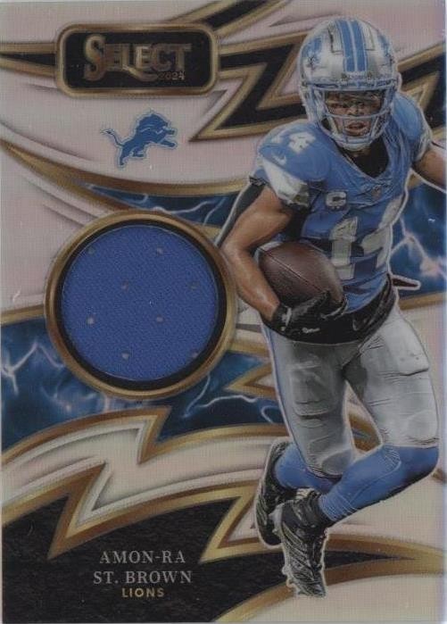 The 2024 Panini Select - Sparks - Amon-Ra St. Brown #S-ASB Silver Prizm /149 is a limited edition sports trading card featuring the talented football player Amon-Ra St. Brown from the Detroit Lions. This card, part of the Sparks insert set, is a serial numbered Silver Prizm parallel variety with a print run of only 149. Manufactured by Panini in the United States, this standard-sized card is a highly sought-after collectible for fans and collectors of NFL trading cards. With its unique design and rarity, this card is a valuable addition to any sports memorabilia collection.