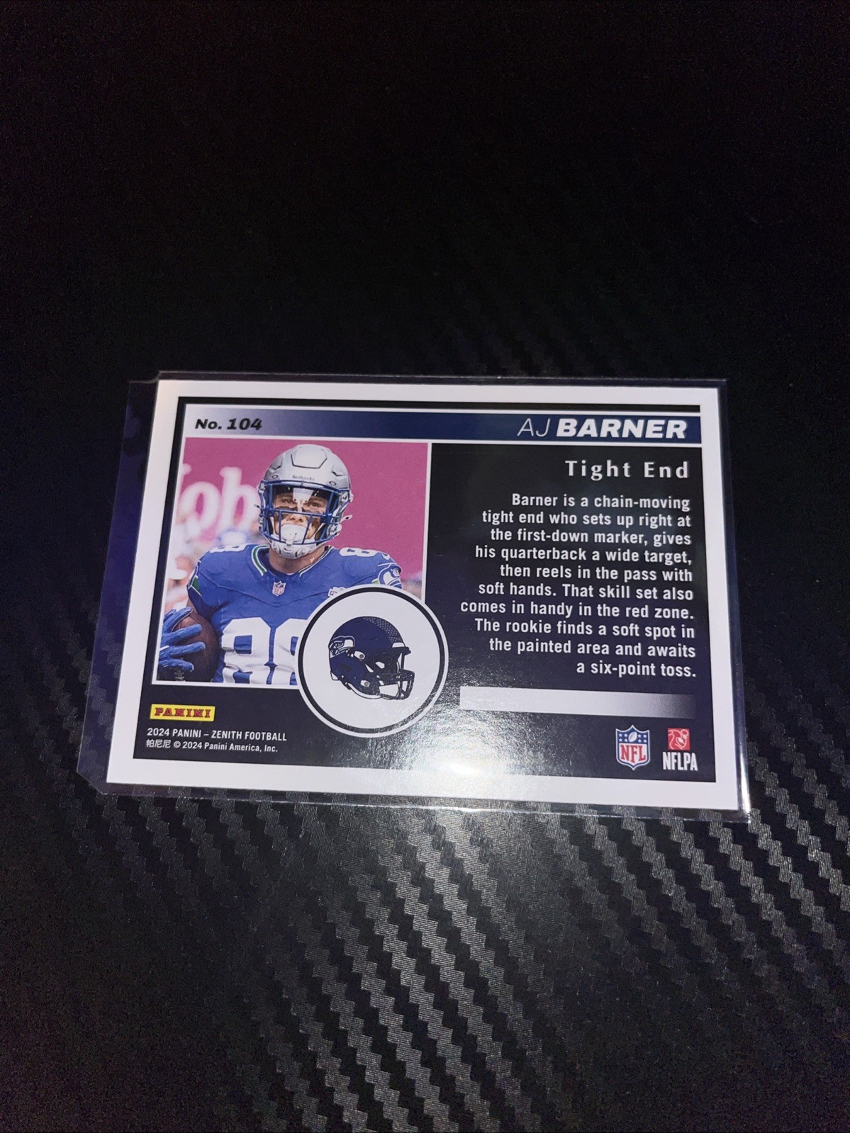 The product is a 2024 Panini Zenith Red No Huddle AJ Barner Rookie Card with a unique error. This sports trading card features a parallel variety, limited edition design, and collectors edition status. It is a part of the National Football League (NFL) set and showcases the Seattle Seahawks team. The card includes features like serial numbering, hologram, short print, and is a chase item for collectors looking to complete their collection. With its original design, exclusive elements, and rookie status, this card is a valuable addition to any football memorabilia collection.