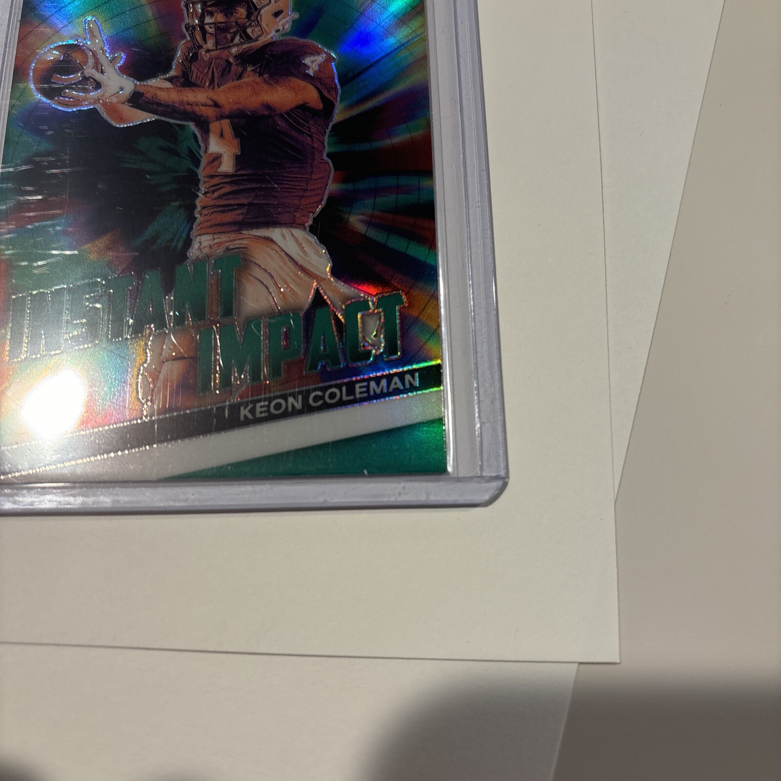 The product is a 2024 Prizm Draft Picks trading card featuring Keon Coleman in the Instant Impact Green Prizm parallel. The card is in near mint or better condition and is considered a rookie card.