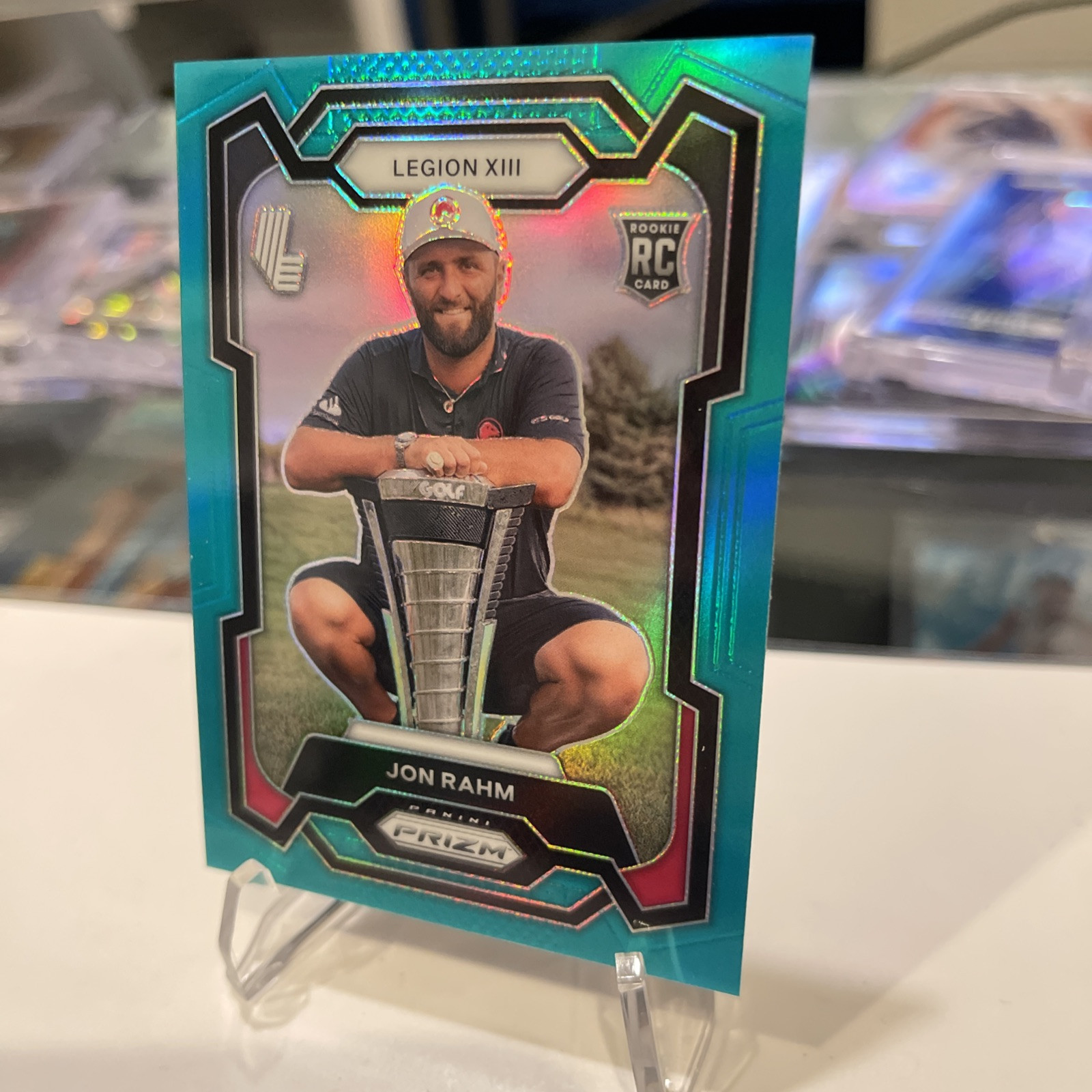Elevate your sports card collection with the 2024 Prizm LIV Golf Jon Rahm Rookie Variation Teal Prizm /199 π₯ Legion XIII. This highly sought-after card features the top-ranked golfer on the PGA Tour, Jon Rahm, in his rookie year with LIV Golf. The Teal Prizm parallel variety adds a unique and eye-catching element to this already impressive card. With only 199 prints run, this serial numbered card is a must-have for any serious collector. The card is a part of the 2024 Prizm Liv Golf set and features Jon Rahm in his Legion XIII team uniform. Don't miss out on the opportunity to own this rare and valuable card.