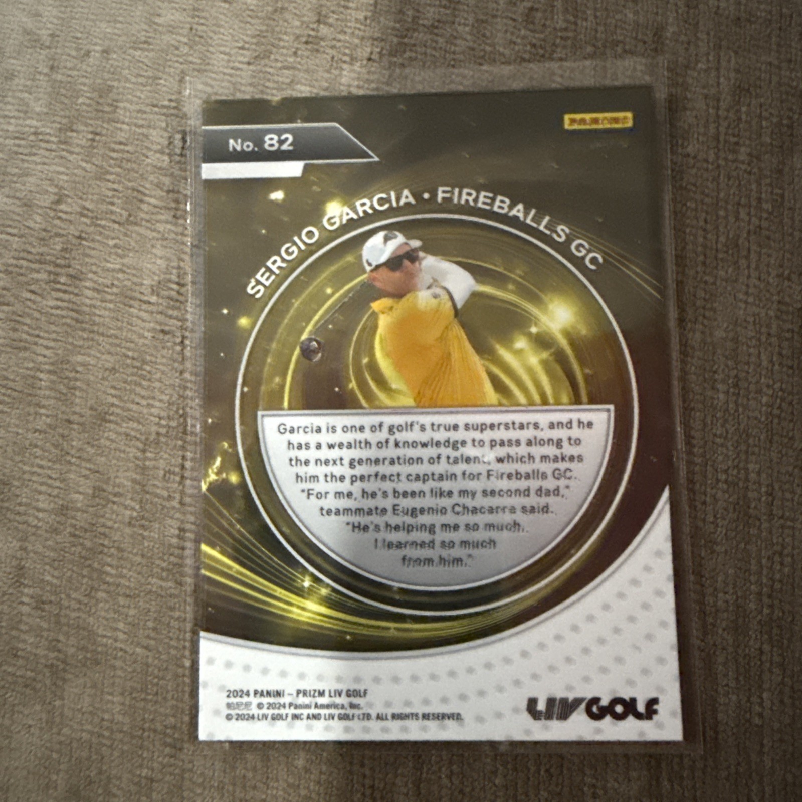 The product is a 2024 Prizm Liv Golf trading card featuring Sergio Garcia, specifically from the Captains Fireballs GC set (card number 82). This sports trading card is considered near mint or better and is ungraded. As part of the Prizm parallel/variety, it likely has a shiny and colorful design that is popular among collectors. This card showcases the talented golfer Sergio Garcia in a specific season and is a sought-after item for golf enthusiasts and trading card collectors alike.