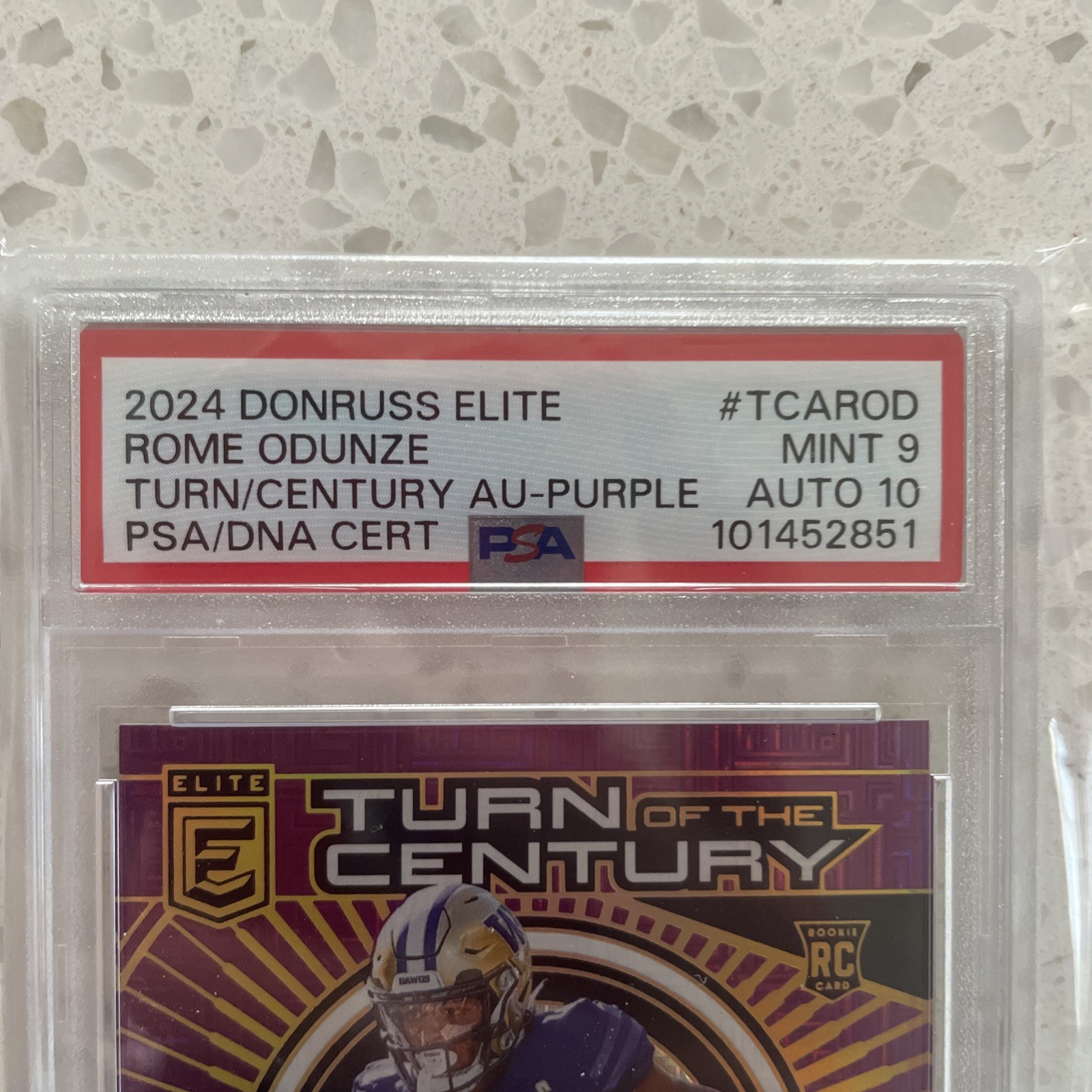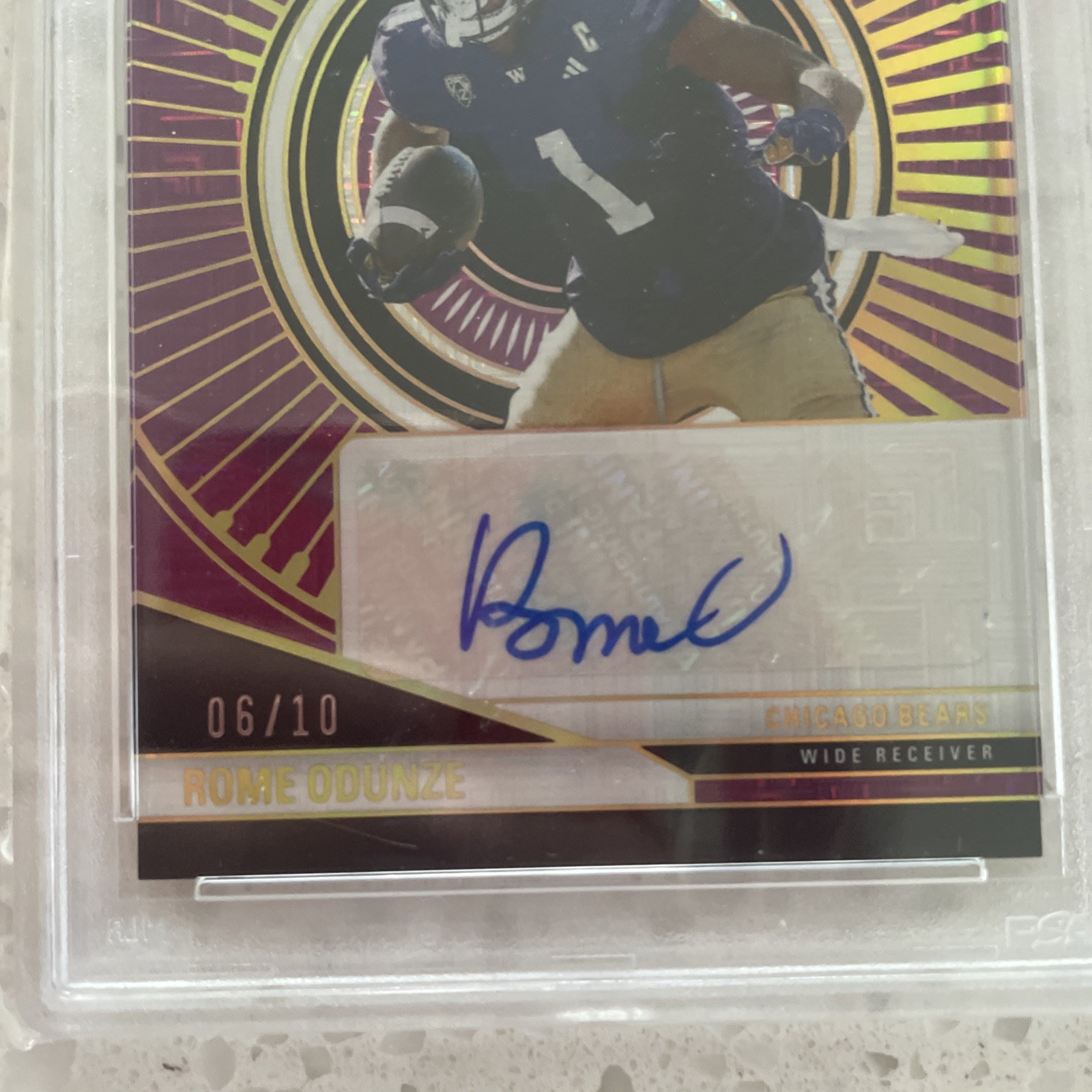 Elevate your football card collection with the 2024 Donruss Elite Turn Of The Century Purple autographed card featuring the promising talent, Rome Odunze. This limited edition piece, numbered to just 10, showcases Odunze in his Chicago Bears and Washington Huskies days, bridging his collegiate prowess with his professional future in the NFL. The card, part of the revered Turn Of The Century Rookie Autographs insert set, is crafted by Panini and has been meticulously graded by the Professional Sports Authenticator (PSA), receiving a perfect score of 10. With its stunning purple parallel variety and serial numbering, this card is a true gem for enthusiasts and collectors alike, celebrating the 2024 season with unmatched prestige.