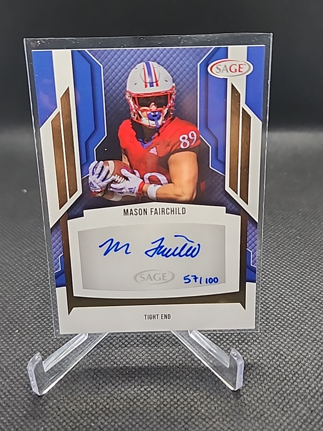 The product is a 2024 SAGE HIT Low Series trading card featuring an autograph of Mason Fairchild from the Kansas Jayhawks football team. It is a Gold parallel variety card with a print run of 100 copies. The card is serial numbered and is categorized as a rookie insert.
