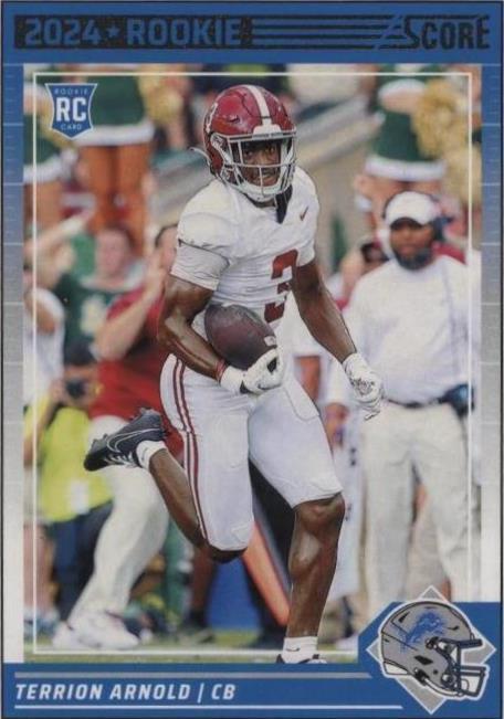 The product is a 2024 Panini Score Terrion Arnold Rookie #315 trading card featuring the player from the Detroit Lions in the National Football League (NFL). This sports trading card is part of the base set for the 2024 Score collection by Panini, making it a desirable item for fans and collectors of football memorabilia. The card showcases the rookie player, Terrion Arnold, adding to its appeal for fans of the Detroit Lions or collectors looking to add a piece of NFL history to their collection.