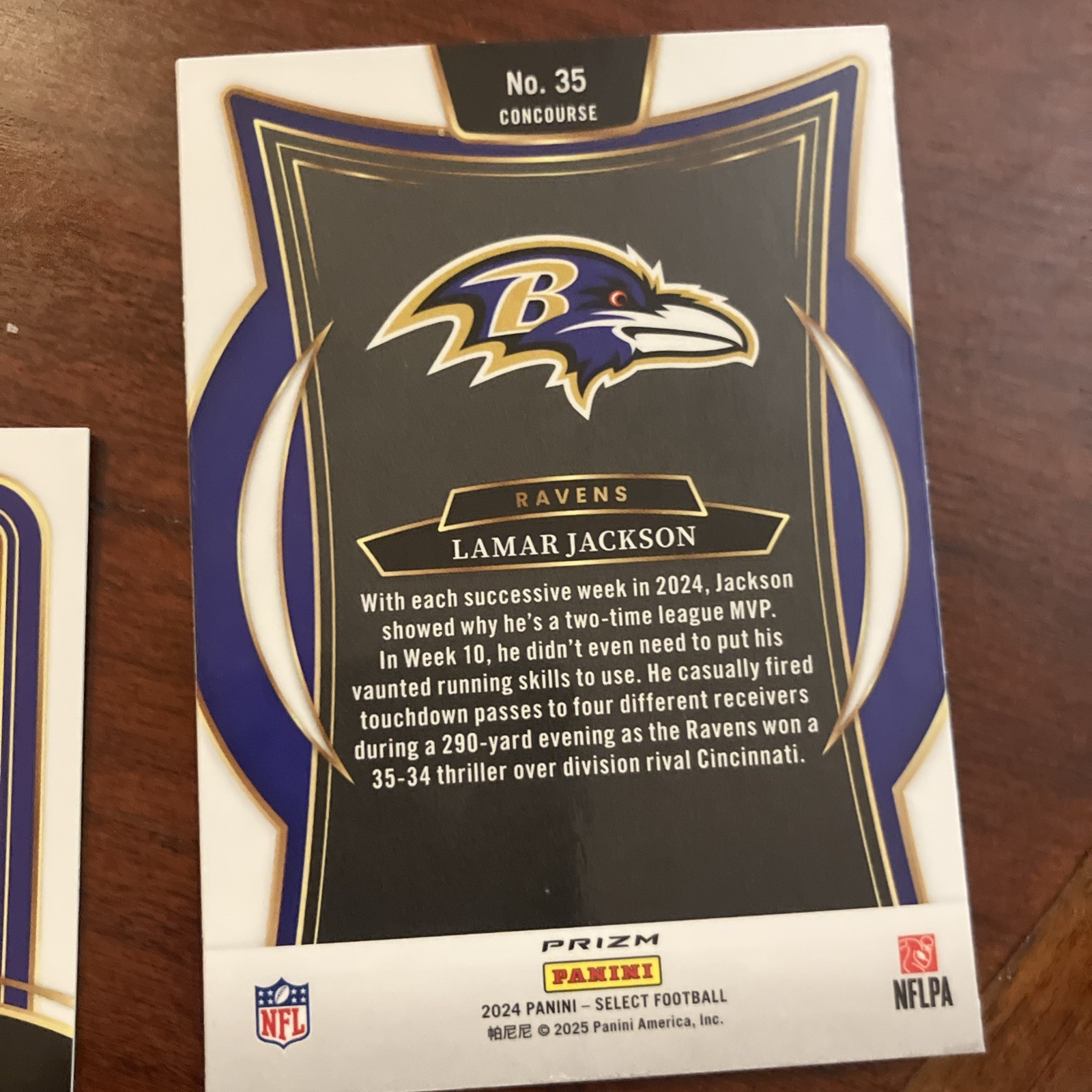The product is a 2024 Select Lamar Jackson Premier Level Orange Prizm trading card, numbered out of 399. This sports trading card features a parallel variety design with a red, white, and blue (RWB) Prizm effect. Manufactured by Select, the card showcases the Baltimore Ravens quarterback in the National Football League (NFL) season of 2024. It is a highly sought-after collectible for fans and collectors of football trading cards, known for its rarity and unique design.