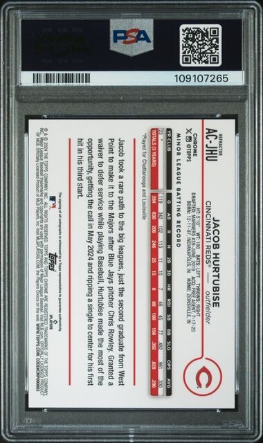 Up for sale is a 2024 Topps Chrome Refractor Autograph #ACJHU Jacob Hurtubise Rookie Card (RC), serial numbered 046/499, graded PSA 9/10 – Mint card and Gem Mint autograph. This classic Refractor Auto features Jacob Hurtubise of the Cincinnati Reds on his official Topps Chrome rookie card , with a sharp on-card autograph and limited serial numbering of 046/499 . Professionally graded PSA 9 for the card and PSA 10 for the autograph , this is a strong modern rookie collectible. Card Details: Player: Jacob Hurtubise Team: Cincinnati Reds Set: 2024 Topps Chrome Card Number: #ACJHU Rookie Card: Yes (RC) Parallel: Refractor Autograph: On-card Serial Number: 046/499 Card Grade: PSA 9 (Mint) Auto Grade: PSA 10 Certification Number: 109107265 About the Player: Jacob Hurtubise has become a fan favorite in the Reds organization with his hustle, strong on-base skills, and defensive versatility. As an under-the-radar prospect who climbed quickly through the system, Hurtubise is the kind of grinder who often outperforms expectations. His 2024 Topps Chrome rookie auto is a great early piece in what could become a compelling MLB career. About the Card: The Refractor Autograph is one of the most recognizable and popular parallels in Topps Chrome, known for its rainbow shine and crisp design. This version, serial numbered 046/499 , features a clean on-card signature and top-tier grades: PSA 9 Mint for the card and PSA 10 for the autograph. Why This Card? ✅ Official Topps Chrome Rookie Autograph (RC) ✅ Clean Refractor finish – serial numbered 046/499 ✅ On-card autograph – PSA 10 ✅ PSA 9 Mint condition ✅ Great value play for Reds fans and rookie collectors alike Add this beautifully graded PSA 9/10 Refractor RC Auto of Jacob Hurtubise to your collection today! Thanks for looking, and happy collecting! ⚾🌈🔴