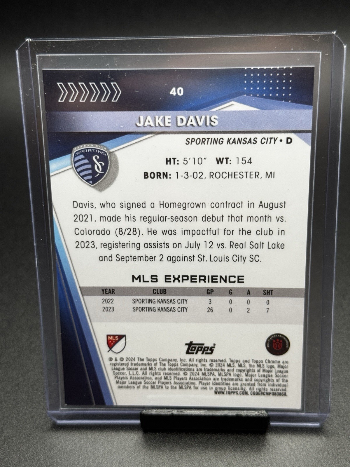 The product is a 2024 Topps Chrome MLS Rose Gold Refractor trading card featuring rookie player Jake Davis from Sporting Kansas City. Limited to a print run of only 250, this single-parallel card is a highly sought-after collectible for soccer fans and trading card enthusiasts. With its eye-catching design and exclusive features, this card is a valuable addition to any sports trading card collection, highlighting the talent of a rising star in Major League Soccer.