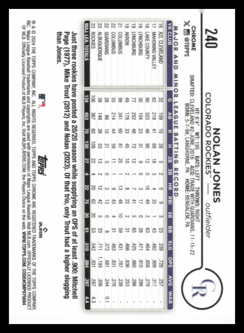 2024 Topps Chrome Nolan Jones Cards typically ship each morning around 5 am. I offer the following shipping services: ebay standard envelope: this is put in a semi rigid card holder with a piece of blue painters tape sealing it and in a plain white envelope with tracking. This is typically for cheaper cards ($20 or less). This service may not be available for thicker cards. USPS First Class: this is put in a top loader, then into a team bag with a piece of card board in it as well. Then shipped in a bubble mailer with tracking. This is for individuals that do not like the idea of the plain white envelope or for cards $20-100. USPS Priority Small Flat Rate Box: this is put into a top loader, then into a priority bubble mailer, then lastly into a flat rate priority box with tracking. Ideally for cards priced over $100. Please check my store as I combine shipping.