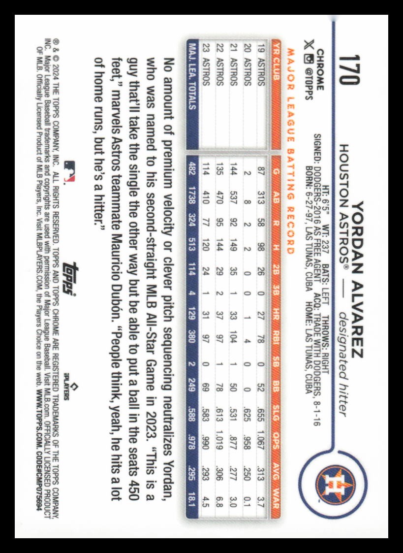 2024 Topps Chrome Yordan Alvarez Cards typically ship each morning around 5 am. I offer the following shipping services: ebay standard envelope: this is put in a semi rigid card holder with a piece of blue painters tape sealing it and in a plain white envelope with tracking. This is typically for cheaper cards ($20 or less). This service may not be available for thicker cards. USPS First Class: this is put in a top loader, then into a team bag with a piece of card board in it as well. Then shipped in a bubble mailer with tracking. This is for individuals that do not like the idea of the plain white envelope or for cards $20-100. USPS Priority Small Flat Rate Box: this is put into a top loader, then into a priority bubble mailer, then lastly into a flat rate priority box with tracking. Ideally for cards priced over $100. Please check my store as I combine shipping.