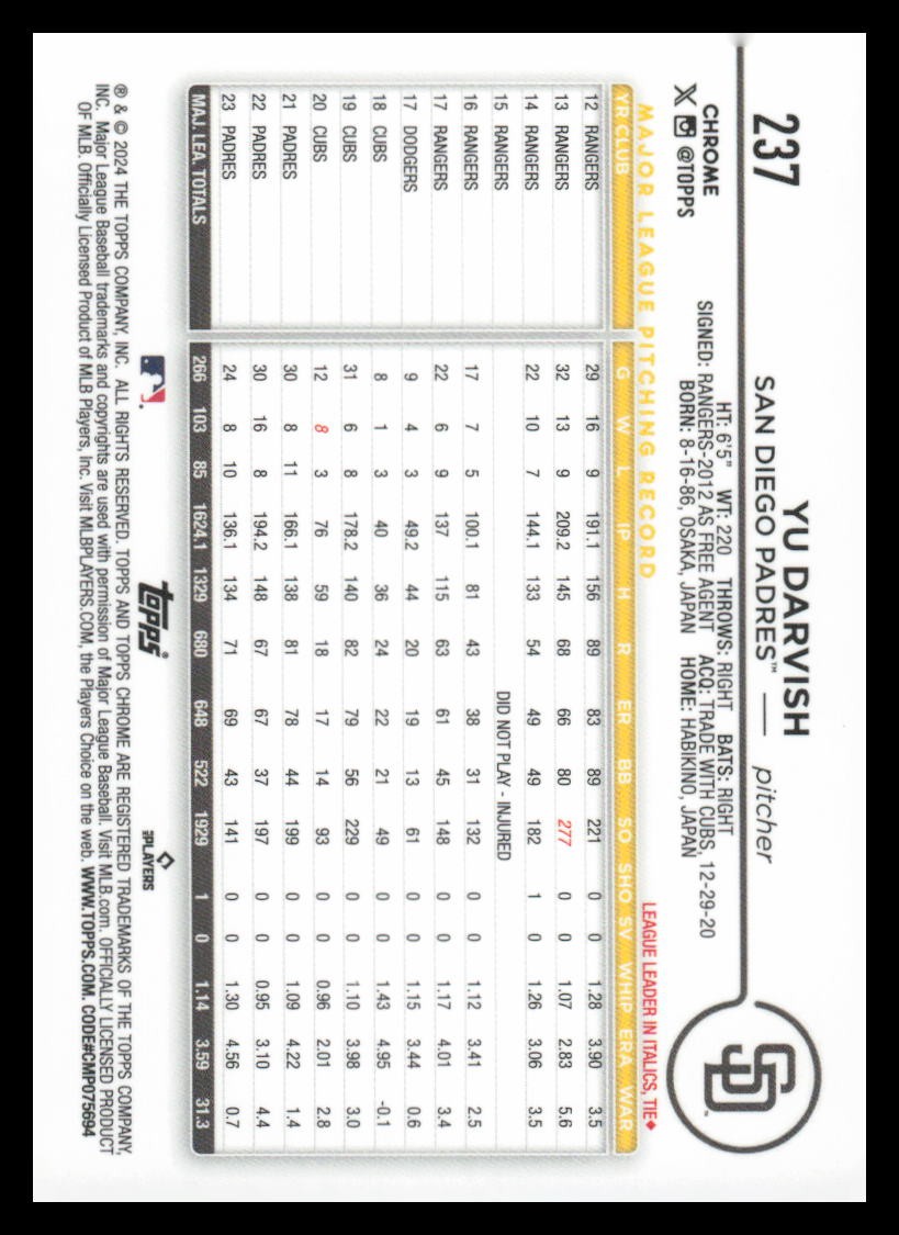 2024 Topps Chrome Yu Darvish Cards typically ship each morning around 5 am. I offer the following shipping services: ebay standard envelope: this is put in a semi rigid card holder with a piece of blue painters tape sealing it and in a plain white envelope with tracking. This is typically for cheaper cards ($20 or less). This service may not be available for thicker cards. USPS First Class: this is put in a top loader, then into a team bag with a piece of card board in it as well. Then shipped in a bubble mailer with tracking. This is for individuals that do not like the idea of the plain white envelope or for cards $20-100. USPS Priority Small Flat Rate Box: this is put into a top loader, then into a priority bubble mailer, then lastly into a flat rate priority box with tracking. Ideally for cards priced over $100. Please check my store as I combine shipping.