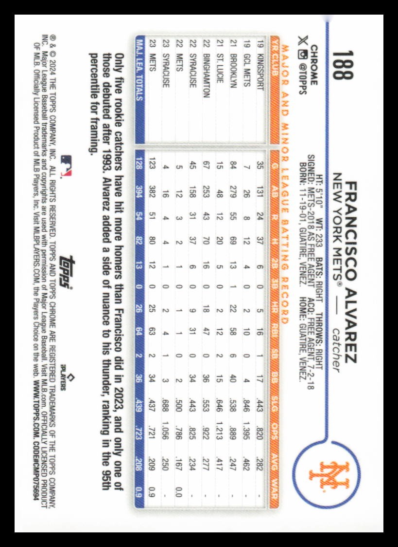 2024 Topps Chrome Francisco Alvarez Cards typically ship each morning around 5 am. I offer the following shipping services: ebay standard envelope: this is put in a semi rigid card holder with a piece of blue painters tape sealing it and in a plain white envelope with tracking. This is typically for cheaper cards ($20 or less). This service may not be available for thicker cards. USPS First Class: this is put in a top loader, then into a team bag with a piece of card board in it as well. Then shipped in a bubble mailer with tracking. This is for individuals that do not like the idea of the plain white envelope or for cards $20-100. USPS Priority Small Flat Rate Box: this is put into a top loader, then into a priority bubble mailer, then lastly into a flat rate priority box with tracking. Ideally for cards priced over $100. Please check my store as I combine shipping.