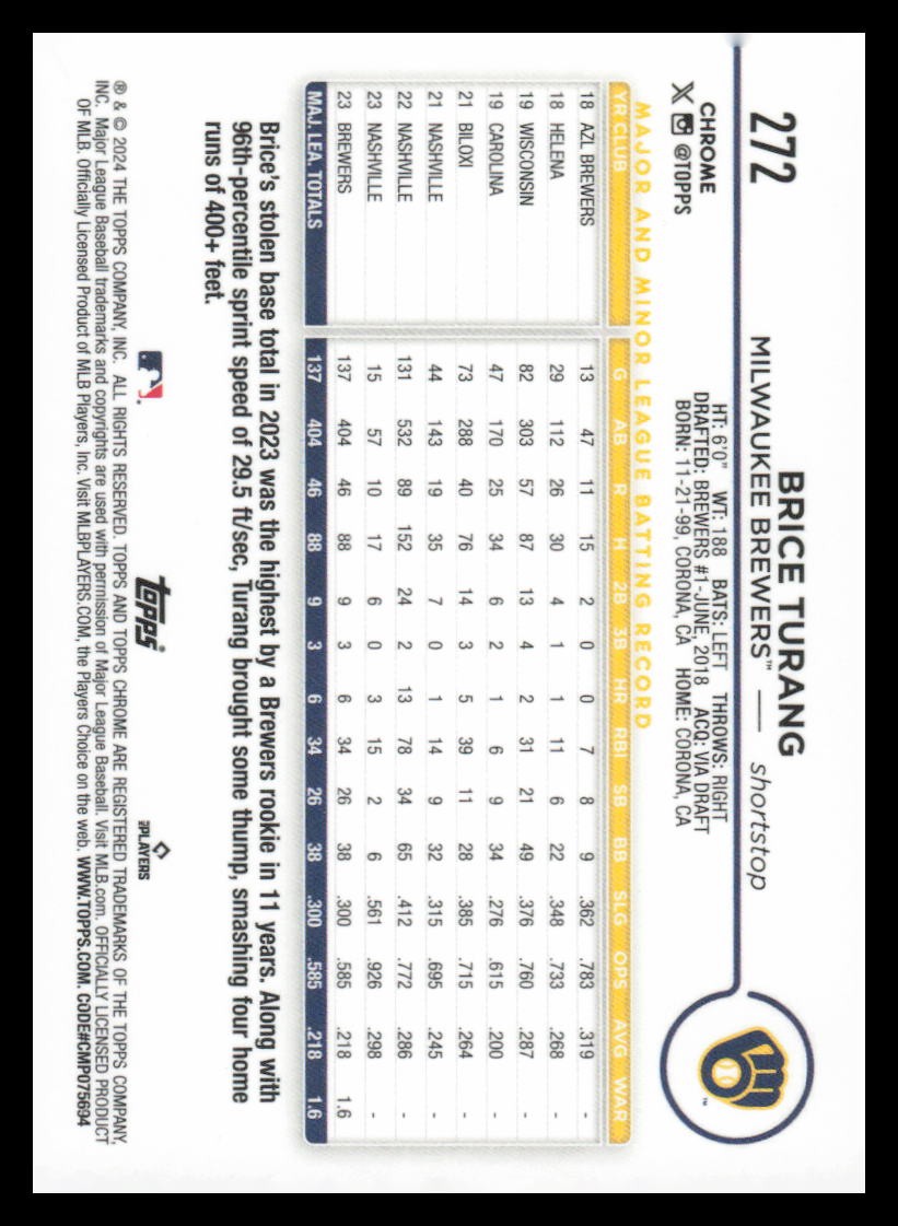 2024 Topps Chrome Brice Turang Cards typically ship each morning around 5 am. I offer the following shipping services: ebay standard envelope: this is put in a semi rigid card holder with a piece of blue painters tape sealing it and in a plain white envelope with tracking. This is typically for cheaper cards ($20 or less). This service may not be available for thicker cards. USPS First Class: this is put in a top loader, then into a team bag with a piece of card board in it as well. Then shipped in a bubble mailer with tracking. This is for individuals that do not like the idea of the plain white envelope or for cards $20-100. USPS Priority Small Flat Rate Box: this is put into a top loader, then into a priority bubble mailer, then lastly into a flat rate priority box with tracking. Ideally for cards priced over $100. Please check my store as I combine shipping.