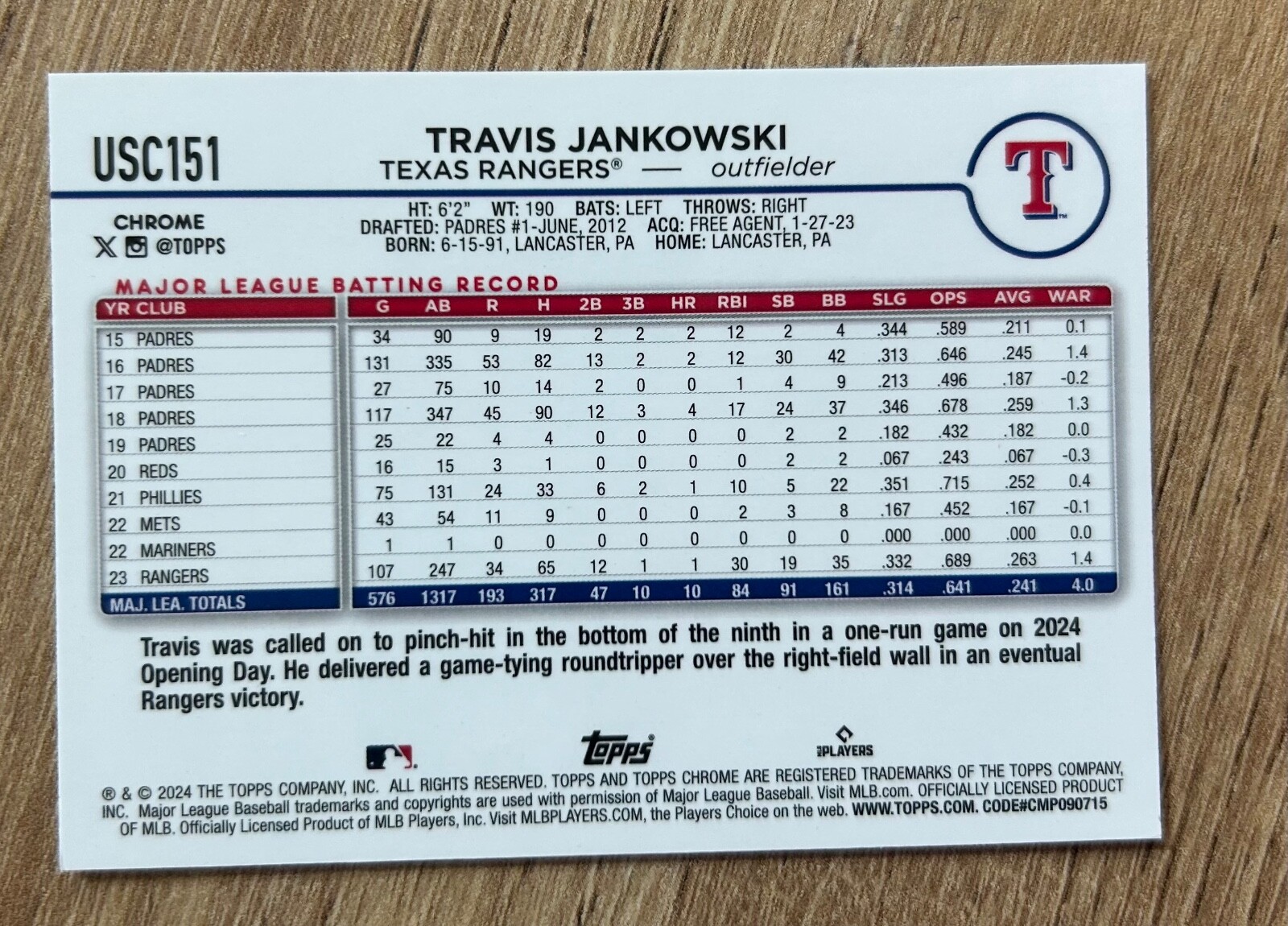 The 2024 Topps Chrome Update Series X-Fractor #USC151 Travis Jankowski Texas Rangers trading card is a highly sought-after collectible for baseball fans and card collectors alike. This original card features Travis Jankowski from the Texas Rangers, part of the Major League (MLB) for the 2024 season. Manufactured by Topps in the United States, this card is made of card stock material and showcases a special X-Fractor parallel variety. With its unique design and limited availability, this sports trading card is a valuable addition to any collection.