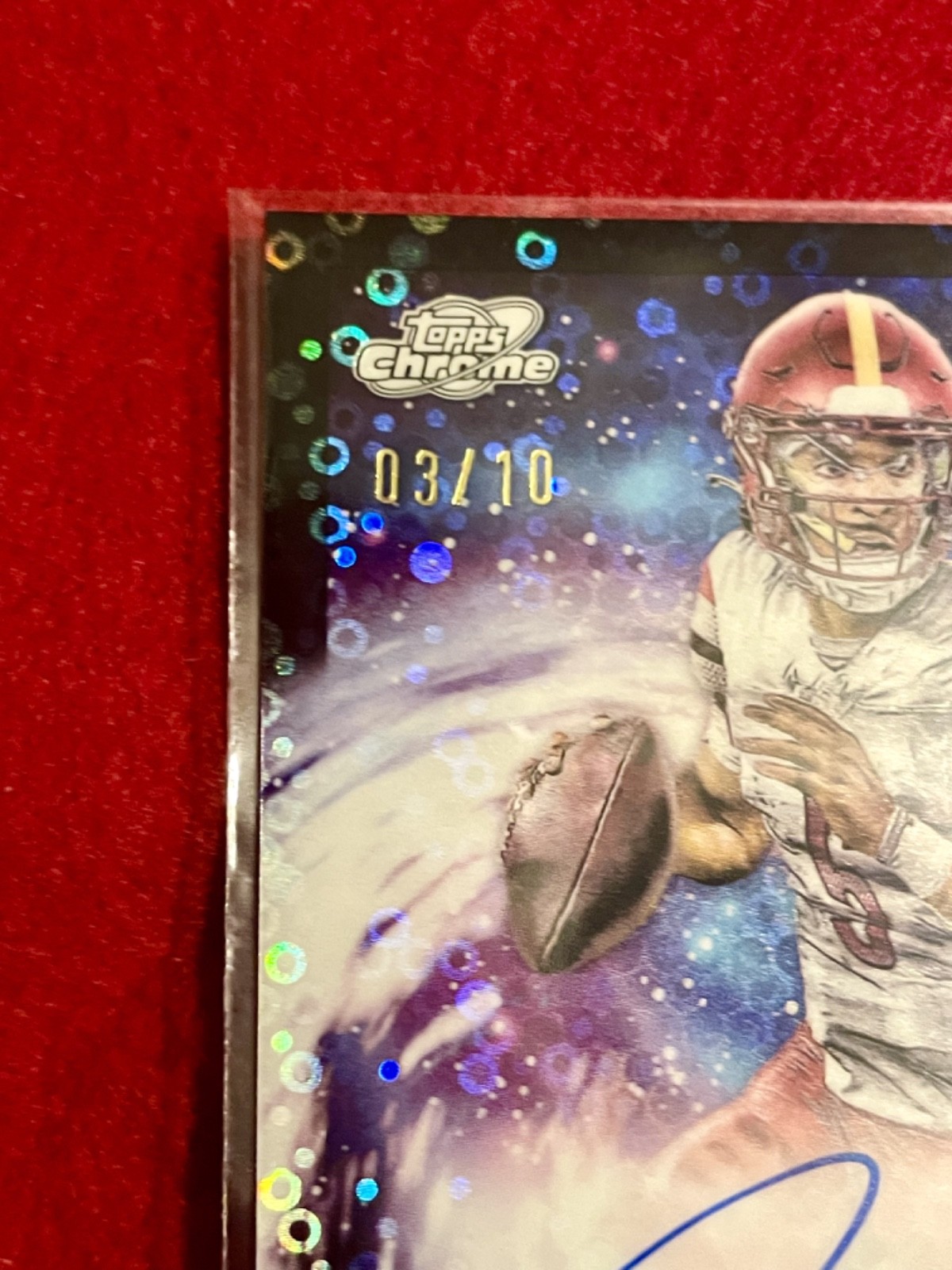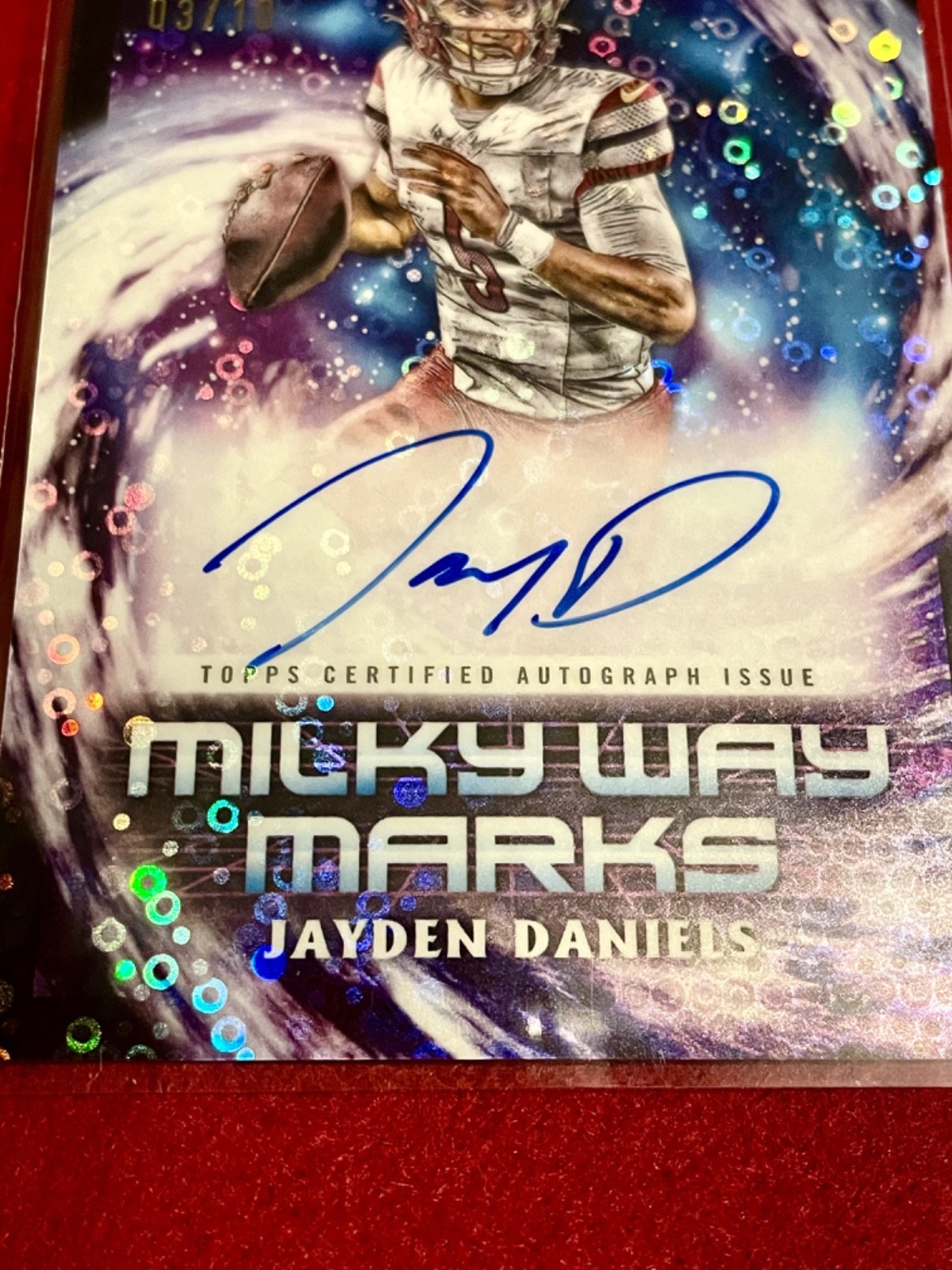 ONE OF JAYDEN DANIELS FIRST EVER ROOKIE“ON CARD” AUTOs NOT a STICKER RELEASED TO PUBLIC. Exclusive AUTO license with TOPPS ONLY. VERY LOW NUMBERED /10 W/ EXCLUSIVE BLACK REFRACTOR. TOPPS COSMIC FIRST EVER RELEASE FOR FOOTBALL. STORED SECURELY DIRECTLY FROM FRESH PACK PULL !! FREE SHIPPING !! SHIPS TODAY W/ UPS 3 DAY SELECT PACKAGED SECURELY. The product is a highly sought-after 2024 Topps Cosmic JAYDEN DANIELS /10 ROOKIE AUTO Milky