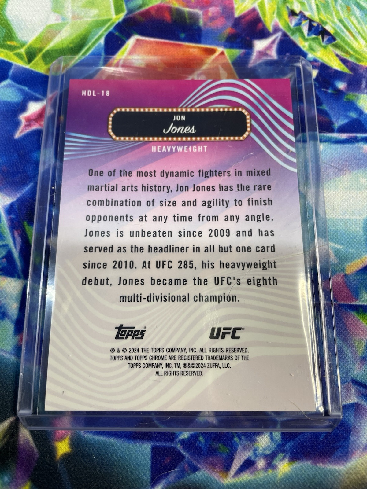 Elevate your UFC collection with the 2024 Topps Finest Jon Jones Green Shimmer Refractor Headliners card, numbered 62/93. This limited-edition sports trading card captures the essence of Mixed Martial Arts with its striking Red Shimmer parallel design, featuring the renowned fighter Jon Jones. Crafted by Topps, a trusted name in sports memorabilia, this card is part of the 2024 Topps Finest set and is a must-have for fans and collectors alike. With its 'HDL-18' card number, this piece stands out as an original insert, showcasing the athlete's dominance and prowess in the Ultimate Fighting Championship league.